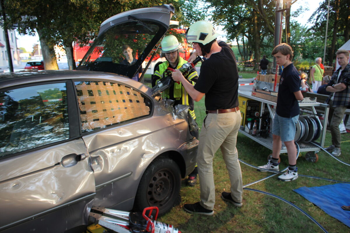 Besonders viel Publikum fand sich bei Jonas Plössner ein, der an einem schrottreifen BMW die Funktion der hydraulisch betriebenen Rettungsscheren, -spreizer und -zylinder und der Glassägen vorführte, mit deren Hilfe eingeklemmte Personen aus Unfallfahrzeugen geborgen werden. Wer wollte, durfte – unter strenger Beachtung aller Sicherheitsvorkehrungen – selbst Hand anlegen.
