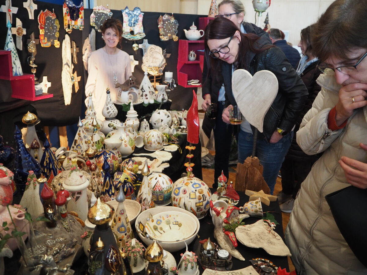 Dabei gibt es aber auch Aussteller, die einfach nicht fehlen dürfen, wie die kunstvoll gestalteten Karten für die verschiedensten Anlässe, aus handgeschöpftem Papier, toll bemalt und mit Texten versehen. Seit 28 Jahren sind Gabi und Thomas Weber aus Pirk mit ihren Töpfersachen dabei. „Wir waren schon im Bärensaal und dürfen immer wieder kommen. Dabei hat sich natürlich der Geschmack des Publikums geändert und wir konnten in diesen Jahren sehr viel dazu lernen. Wir freuen uns immer wieder, wenn wir nach Neustadt kommen dürfen.“