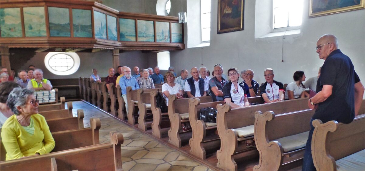 Dort wurden die Radler von dem örtlichen Vertreter schon erwartet. Nach einer kurzen Verschnaufpause führte Karl Prösl, die mittlerweile auf 60 Personen angewachsene Personengruppe, durch die Geschichte der Nikolauskirche in Kohlberg.