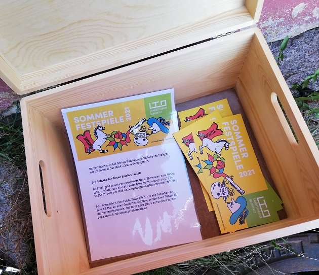 Das LTO will den Tag nutzen und alle Oberpfälzer zu Entdeckern machen. Deshalb hat es an ihren Spielorten der Sommerfestspiele 2021 Kisten versteckt. Die Kisten enthalten kleine Aufgaben, die (einfach) zu erfüllen sind. So können die Oberpfälzer nicht nur unsere Spielorte auf der Naturbühne Schönberg in Grafenwöhr, der Friedrichsburg in Vohenstrauß, der Burgruine in Waldeck, dem Freilandmuseum in Neusath und Schloss Burgtreswitz kennenlernen, sondern auch in die Stücke auf unserem Spielplan eintauchen.