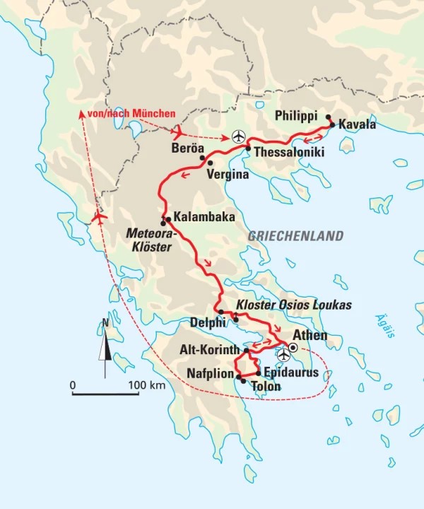 Weitere Stationen der Pilgerreise sind Delphi, das Orakel des antiken Griechenlands, und das byzantinische Kloster Osios Loukas. Auf der Halbinsel Peloponnes wird in antiken Stätten wie Korinth, Epidaurus und Nafplion Station gemacht, die von der reichen Geschichte und Kultur des antiken Griechenlands zeugen.