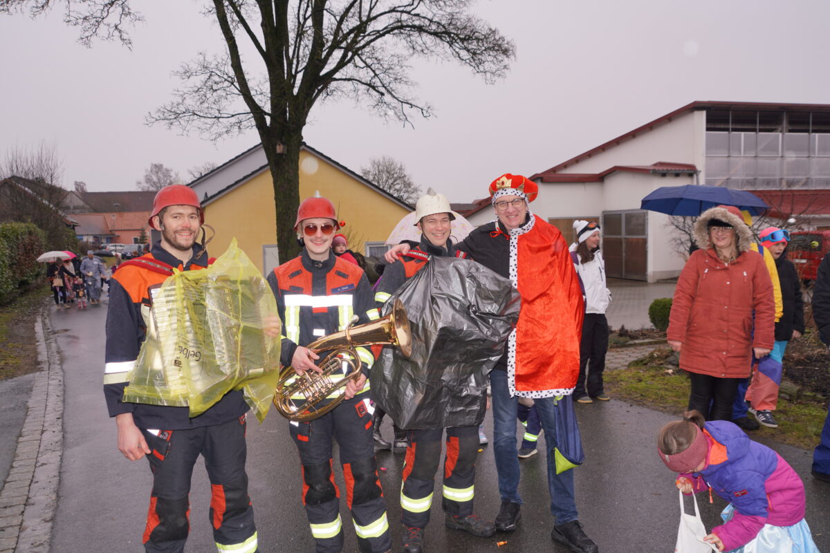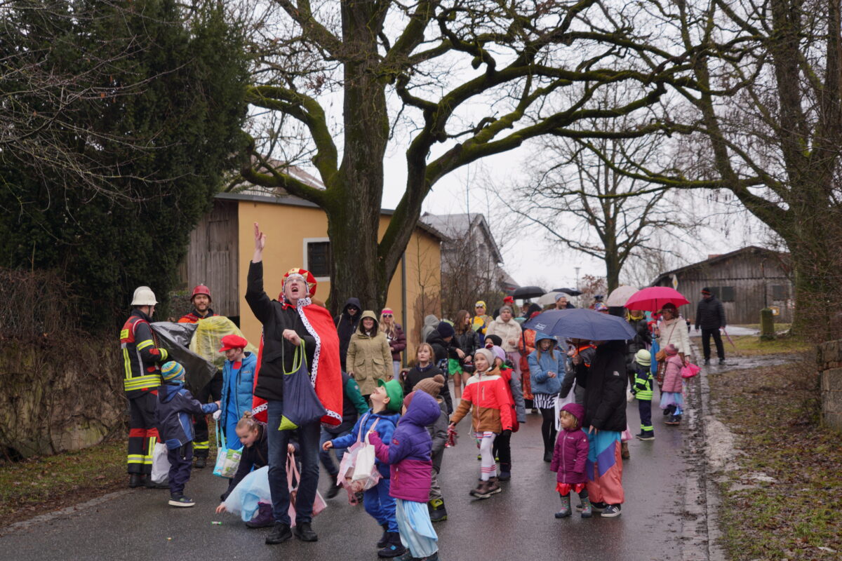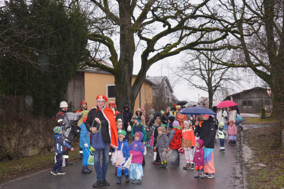 An der Spitze marschierte – wie könnte es anders sein – die „stahlharte KonstiFloMi – Albersriether Feierwehrkapelln“. Konsti, Flo und Michl Stahl heizten mit Flügelhorn, Steirischer und Schifferklavier ordentlich ein. Majestätisch über allen thronte wie seit vielen Jahren wieder Seine Hoheit König Thomas I., der Sächsische Albersriether (Thomas Hörig). Mit Krone und verschmitztem Lächeln dirigierte er nicht nur Kapelle und Narrenschar, sondern schleuderte mit erstaunlicher Treffsicherheit seine genau abgewogenen zehn Kilo „Zuckerln“ unter das junge Narrenvolk. Schnell wurde so mancher Regenschirm und auch Feuerwehrhelm zur Zuckerl – Sammelstation umfunktioniert.
