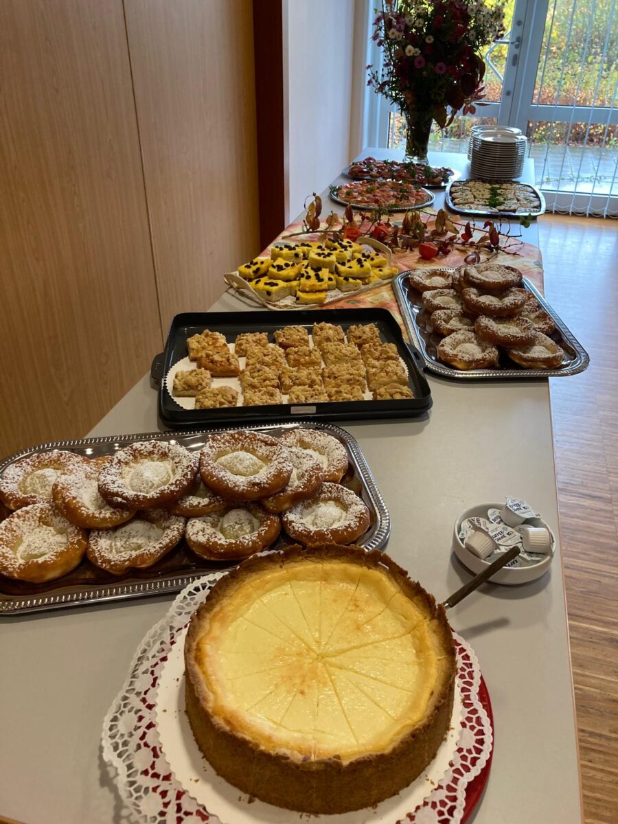 Herbstlich, liebevoll gedeckte Tische erwarteten die Gäste und sofort stach das vorbereitete Büffet ins Auge. Reichlich gedeckt mit Kirchweihspezialitäten wie Kücheln, Kirwakuchen, Käse- und Apfelkuchen war das Büfett aufgebaut. Jedoch auch deftige Sachen fehlten nicht, um allen Wünschen gerecht zu werden. Die Kuchenbäckerinnen und Helferinnen wurden über den Klee gelobt, denn zu Kaffee und weiteren Getränken schmeckten die Köstlichkeiten hervorragend.