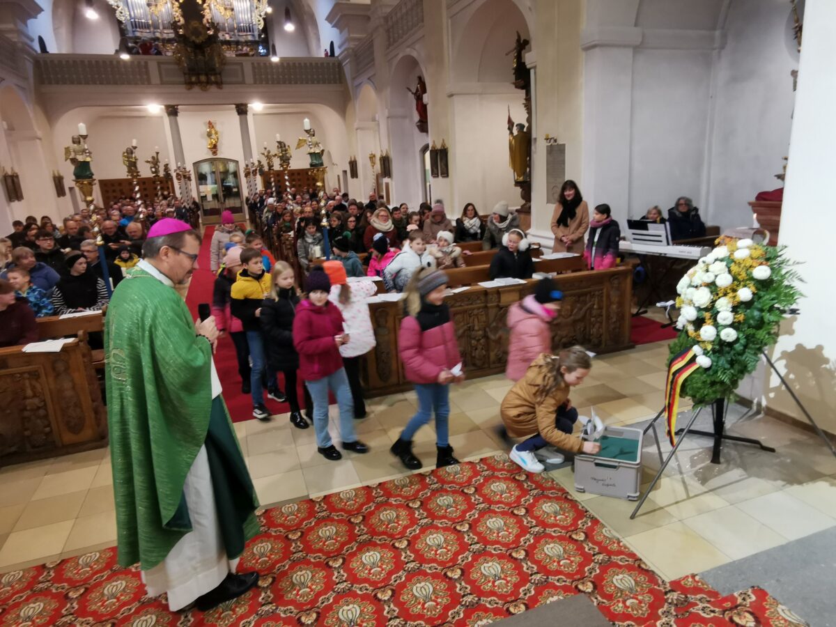 Im Rahmen des Gottesdienstes legen Schulkinder selbstgebastelte Friedenstauben am Trauerkranz ab, während tschechische Jugendliche Frieden in den Vordergrund ihrer Fürbitten stellen. Bischof Holub nutzt die Gelegenheit, um mit den Kindern in einen Dialog zu treten und die Wichtigkeit des Brückenbauens zwischen Menschen und Völkern zu betonen. Den Abschluss des Friedensgottesdienstes bildet das Lied “Ein bisschen Frieden”, dargeboten von Schülern mit musikalischer Begleitung.