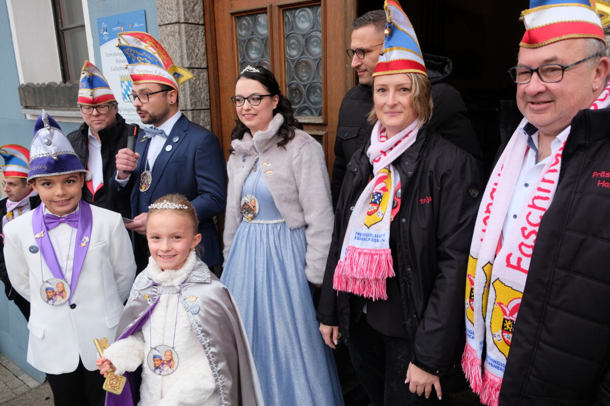 Eine Zusage, die den Bürgermeister schwach werden ließ. „Schon gut. Ich ergebe mich. Nehmt diesen Schlüssel und gebt Acht, stoßt kräftig an, singt und lacht.“ Mit Übergabe des Rathausschlüssels an die neuen Tollitäten Matthias & Lisa und Luiz & Annika war der letzte Widerstand des Bürgermeisters gebrochen und die Übernahme der Regierungsgewalt durch die Außerirdischen vollzogen. Ein Momentum, das die neuen Hoheiten mit einem Appell an das Faschingsvolk verbanden. „Lasst uns feiern, tanzen, lachen und unseren Planeten etwas froher und bunter machen. Von heute bis Aschermittwoch, so geben wir bekannt, hat nur Fröhlichkeit zu herrschen im Eschenbacher Land.“ Eine Zeremonie, die die temperamentvollen Garden mit feurigen Tanzeinlagen und mit viel Helau auf Eschenbach, die Faschingsgesellschaft und die Faschingszeit anreicherten. Mit Unterstützung des Narrenvolkes donnerte das dreifache Helau weit über den Rathausvorplatz hinaus.