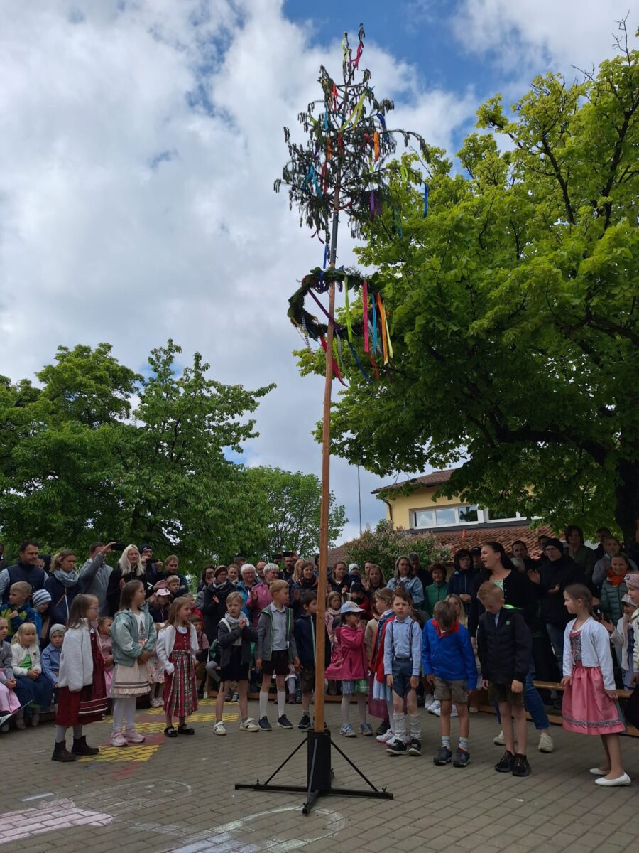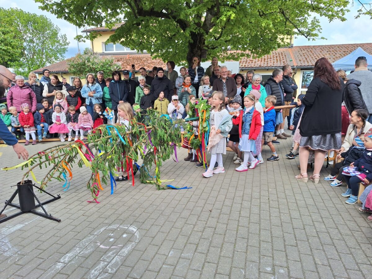 Durch das Programm führten die Vorschulkinder. Sie sangen dazu passende Gstanzl. Die restlichen Kinder der Einrichtung tanzten um den Maibaum und sangen dabei Lieder wie „Wir sind alle Dorfkinder“. Viele Helferinnen und Helfer sorgten dafür, dass das Fest im Anschluss zu einem Fest für die ganze Familie wurde. Leiterin Stephanie Miosga und ihr Team hatten einige Aktionen zum Thema Maifest organisiert. So wurden unter anderem Herzklammern gestaltet, die Kräfte in der Turnhalle beim Maßkrugstemmen und Seilziehen unter Beweis gestellt, Nägel in einen Holzbalken geschlagen, oder eine Fotowand mit Polaroidbildern aufgestellt.