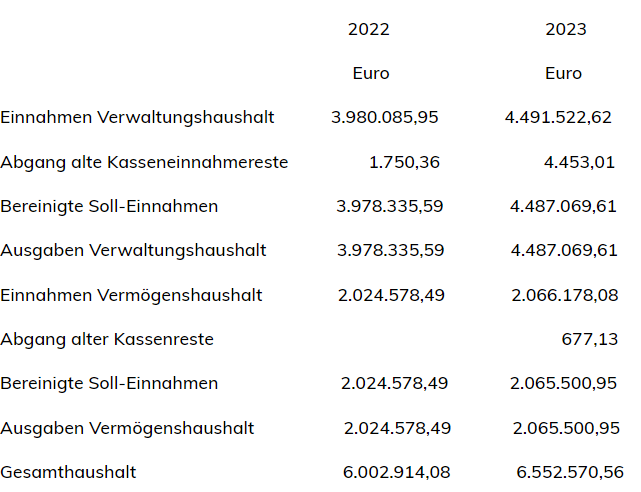Im Rechnungsjahr 2022 werden der allgemeinen Rücklage 333.362,36 Euro zugeführt, sodass der neue Bestand 1.364.309,46 Euro beträgt.