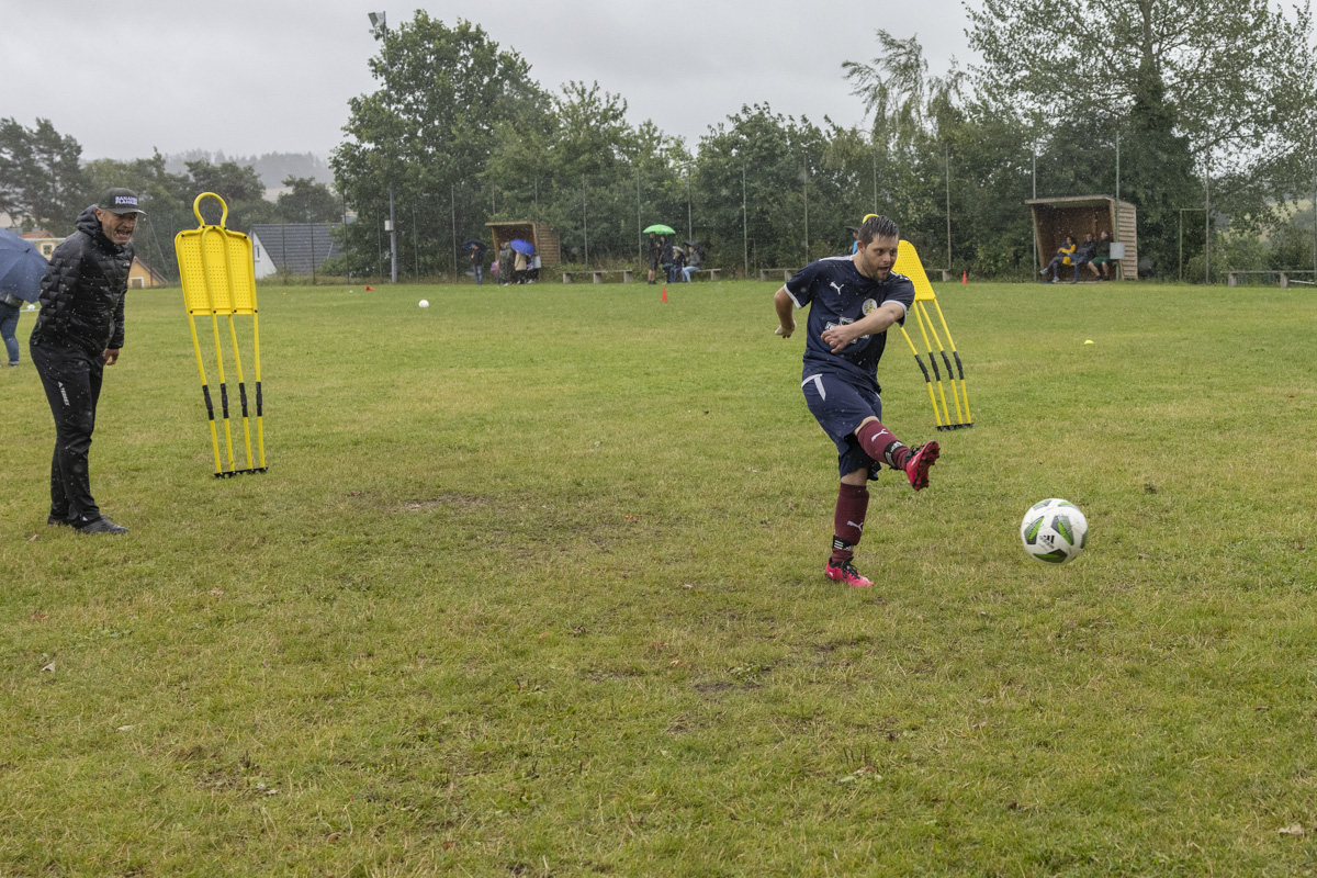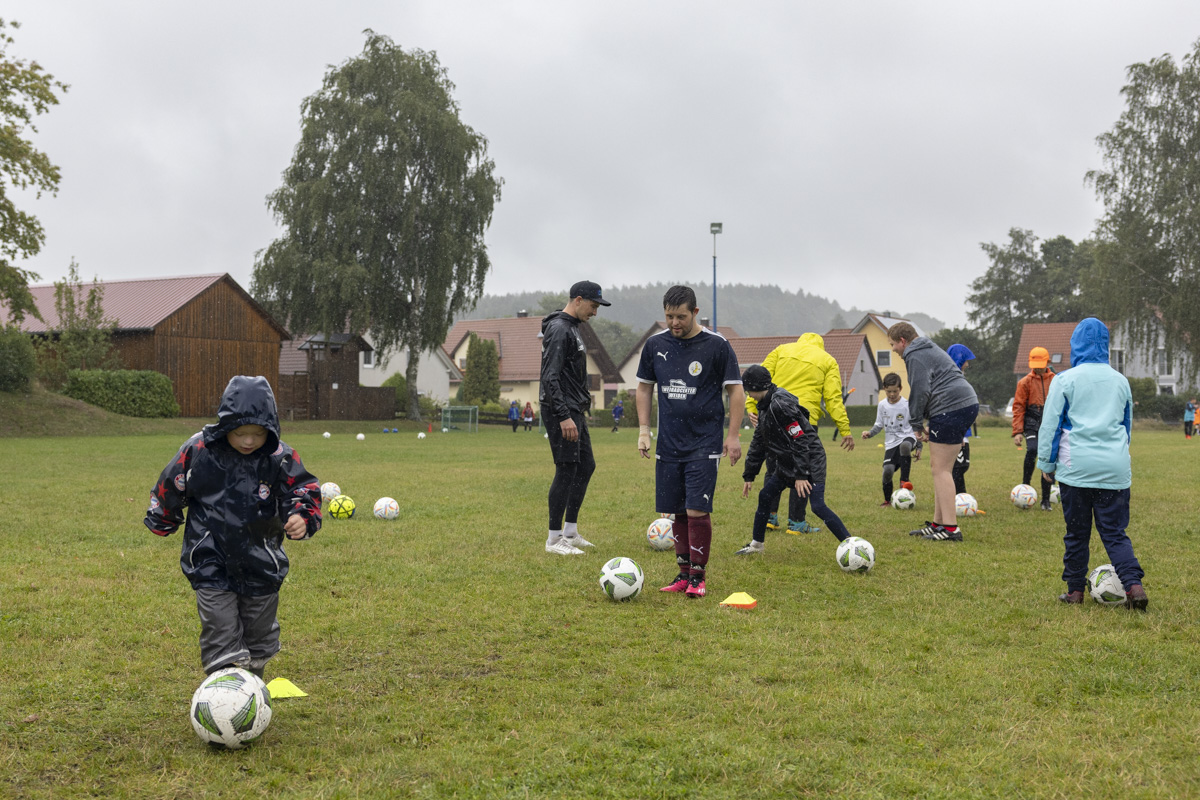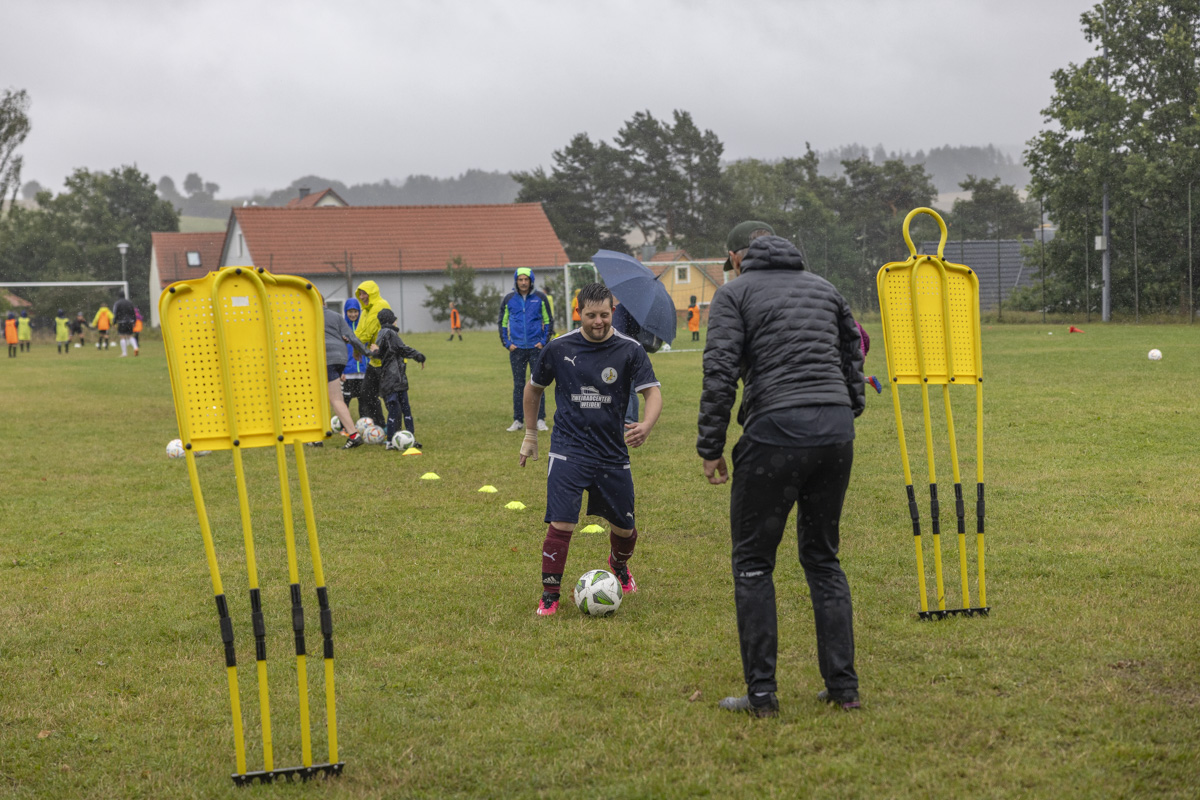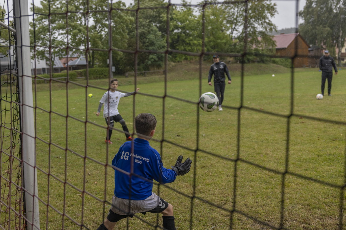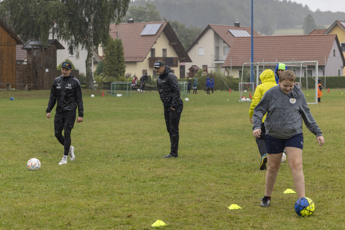 Obwohl auch am dritten Trainingstag dicke Regenwolken über dem Fußballplatz des SV Wildenau hängen, es in Strömen gießt und die Temperaturen kaum über 13 Grad Celsius klettern, ist die Laune bei den Kids grandios. Es gibt kein Meckern und kein Streiten, sondern vollen Einsatz am Ball. Die Kinder und Jugendlichen saugen das Wissen der Fußballlegenden begierig auf und lassen sich nicht vom Wetter ablenken. An mehreren Stationen beweisen sich die jungen Teilnehmer bei Dribbel- und Passübungen, dem Zielschießen und bei Trainingsspielen.