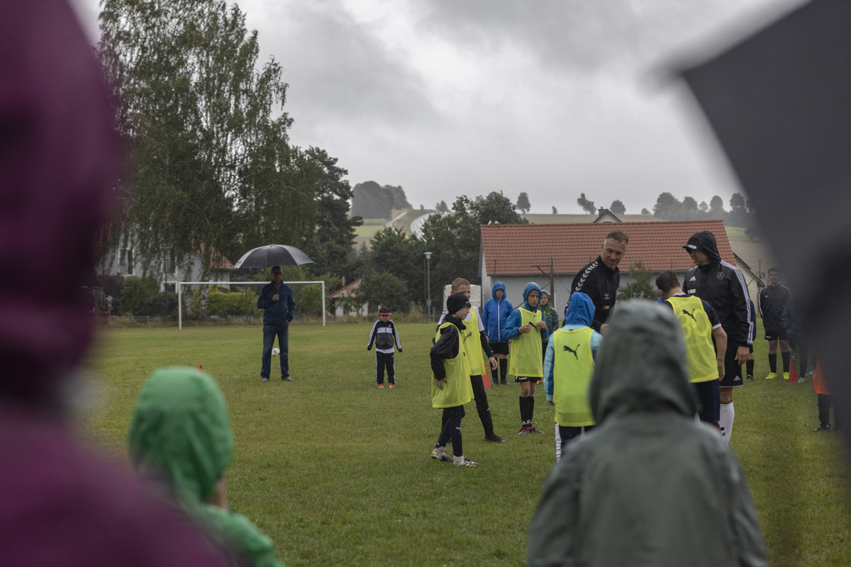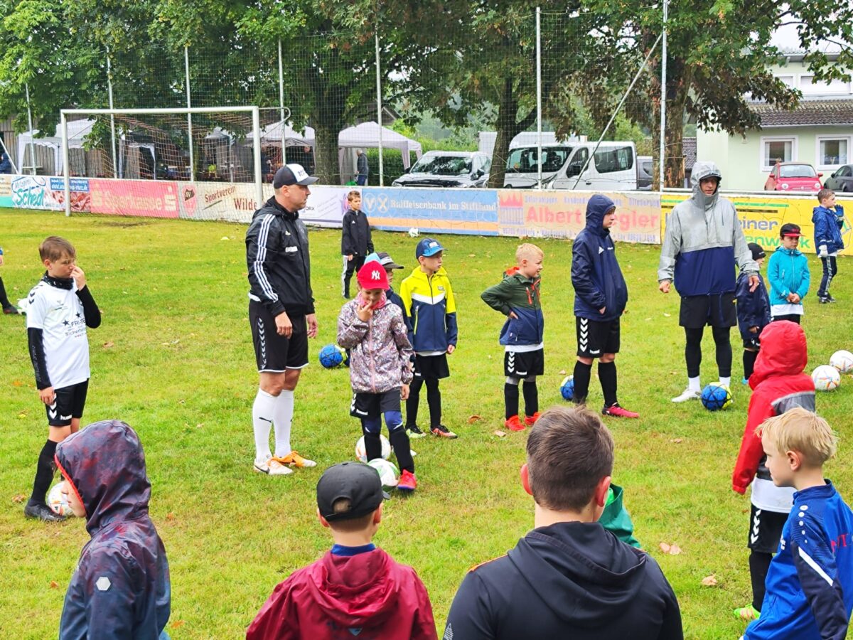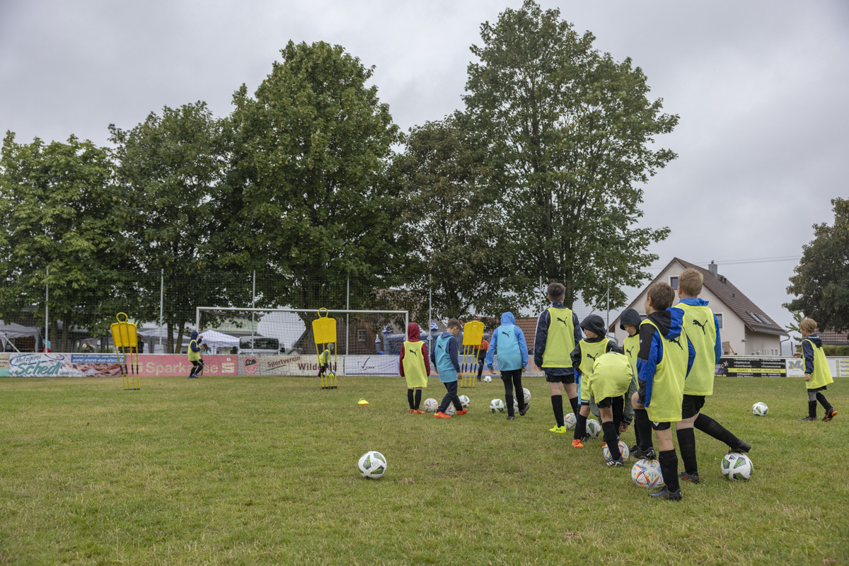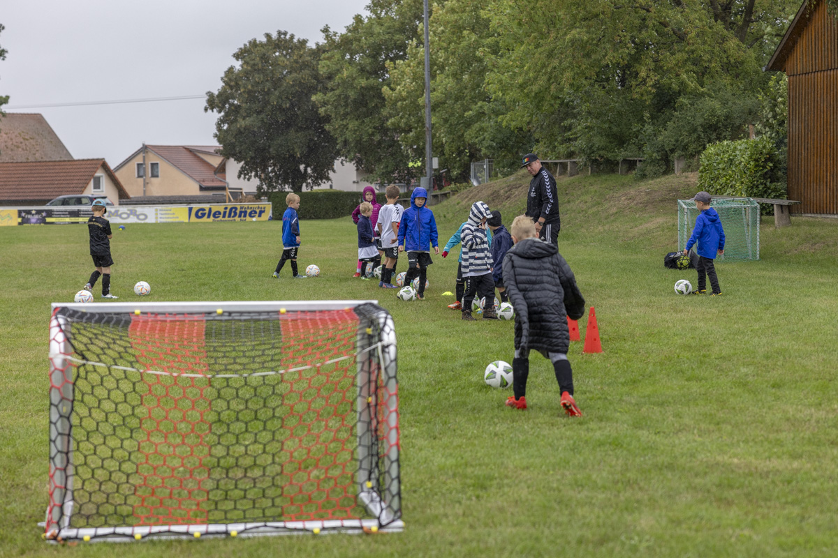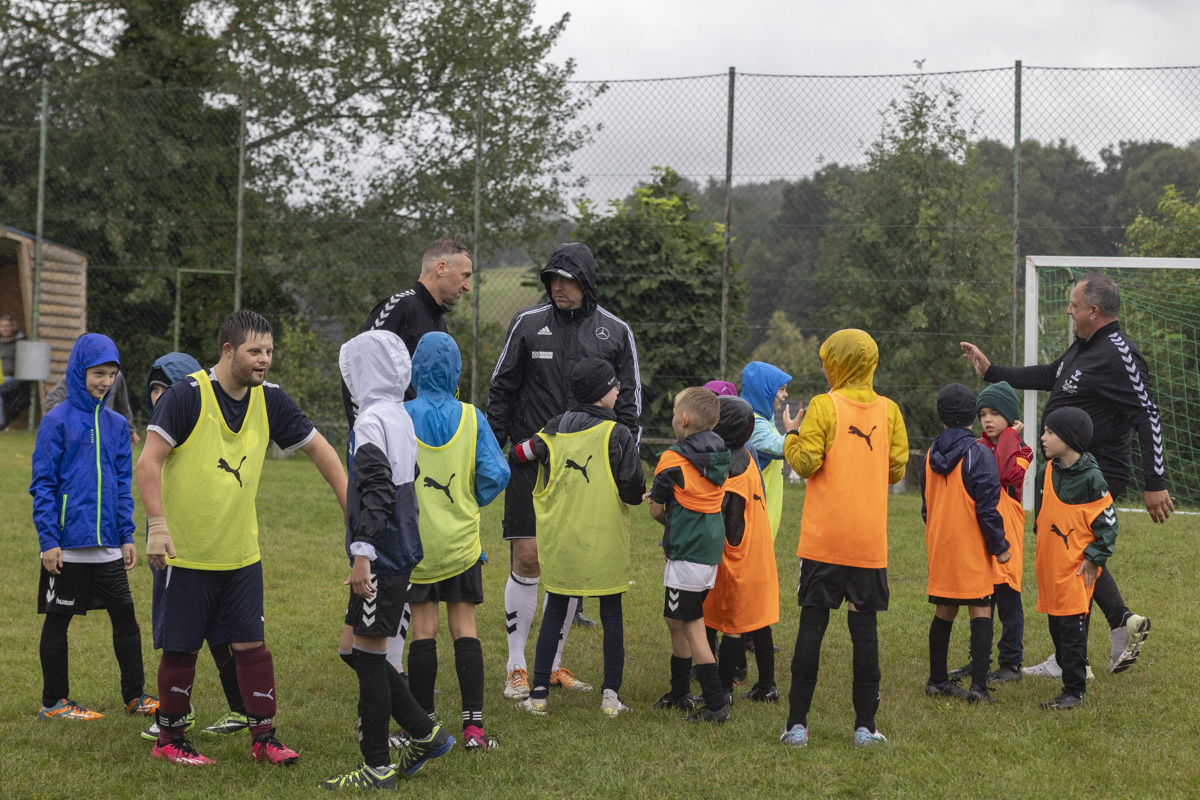 Obwohl auch am dritten Trainingstag dicke Regenwolken über dem Fußballplatz des SV Wildenau hängen, es in Strömen gießt und die Temperaturen kaum über 13 Grad Celsius klettern, ist die Laune bei den Kids grandios. Es gibt kein Meckern und kein Streiten, sondern vollen Einsatz am Ball. Die Kinder und Jugendlichen saugen das Wissen der Fußballlegenden begierig auf und lassen sich nicht vom Wetter ablenken. An mehreren Stationen beweisen sich die jungen Teilnehmer bei Dribbel- und Passübungen, dem Zielschießen und bei Trainingsspielen.