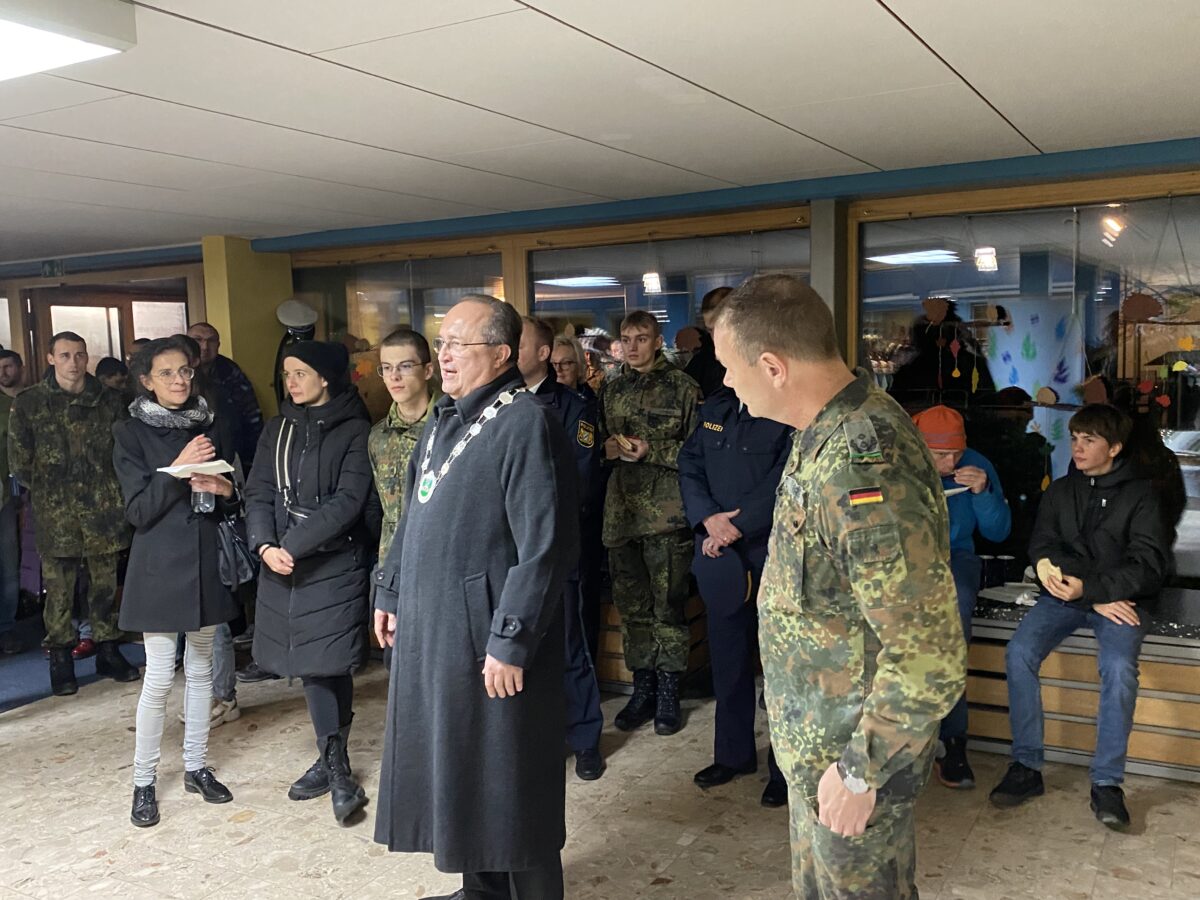 Sechs Soldaten sprachen stellvertretend für alle Rekruten an der Truppenfahne die Eides- und Gelöbnisformel. Oberstleutnant Ralf Georgi, Bürgermeister Gürtler und ausgewählte Ehrengäste bekräftigten das abgegebene Versprechen durch einen Handschlag. Mit der Bayern- und der Nationalhymne wurde der offizielle Teil der Gelöbnisfeier abgeschlossen. Beim anschließenden Empfang in der Schulaula hatte man sich noch viel zu erzählen.