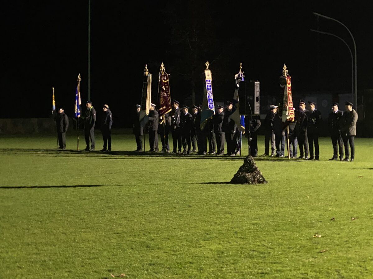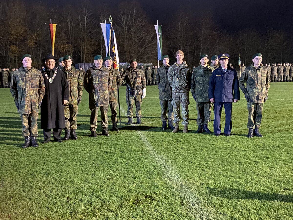 Nach dem Gottesdienst in der Pfarrkirche St. Michael rückten zu den Klängen des Heeresmusikkorps Veitshöchheim, das auch das Zeremoniell begleitete, die Ehrenformationen und 56 Soldatinnen und Soldaten der 4. Kompanie des Panzergrenadierbataillons 122 bei hereinbrechender Dunkelheit in den Schulsportplatz ein.