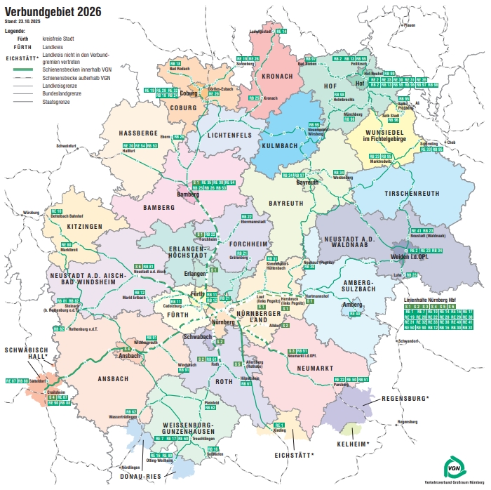 Zum 1. Januar 2026 treten die Stadt Weiden und der Landkreis Neustadt/WN dem VGN bei. Damit sind insgesamt 34 Landkreise und kreisfreie Städte im Norden Bayerns Mitglied im Verkehrsverbund Großraum Nürnberg. Das Gebiet des VGN umfasst künftig 22.000 Quadratkilometer und ist nahezu deckungsgleich mit dem der Metropolregion Nürnberg. Die Zahl der Einwohner im Verbundgebiet steigt auf 3,6 Millionen. Ausführliche Informationen für seine neuen Fahrgäste bietet der Verkehrsverbund.