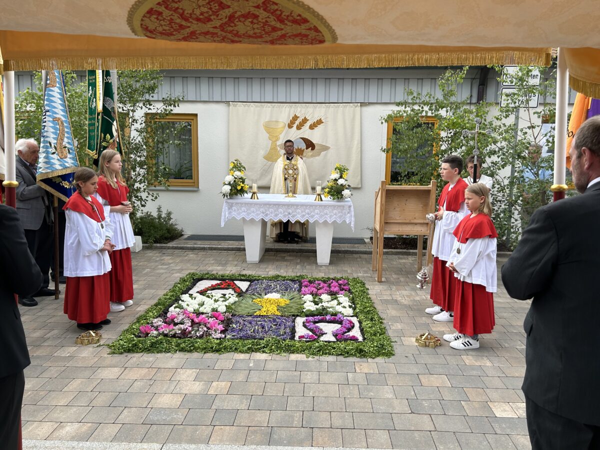 Der dort geschmückte Blumenaltar wurde von vielen fleißigen Händen in den frühen Morgenstunden gestaltet. Die Heilige Messe in der Pfarrkirche wurde vom Kirchenchor unter Leitung von Michael Scherm feierlich musikalisch begleitet. Kaplan Justin Kishimbe bedankte sich ausdrücklich bei allen Teilnehmern und Helfern, die zum Gottesdienst und zur Prozession beitrugen oder auch nur einfach daran teilnahmen – eine Demonstration des Glaubens, freute sich der Geistliche. Sein besonderer Willkommensgruß galt Bürgermeister Thomas Kaufmann, der mit vielen Gemeinderäten ebenso an der Prozession teilnahm wie die Vereine, die nicht nur mit ihren acht Fahnenabordnungen gekommen waren, sondern auch mit vielen ihrer Mitglieder ihr Bekenntnis zum Glauben demonstrierten.
