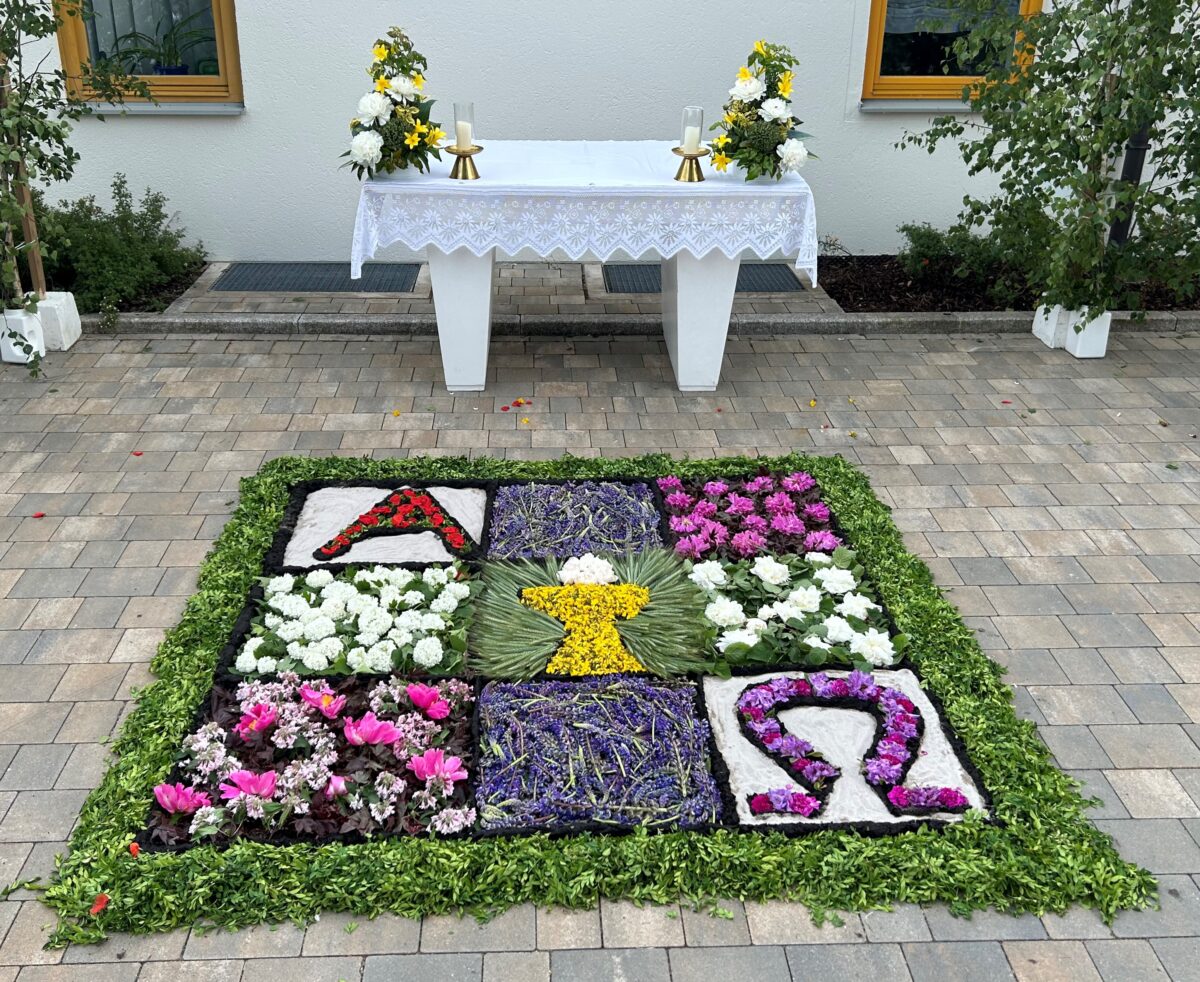 Am Kindergarten angekommen lag vor dem Altar ein mit viel Mühen geschmückter Blumenteppich, der bereits am frühen Morgen von vielen fleißigen Händen hergerichtet wurde. Anschließend zog man bei einem strahlenden blauen Himmel zurück zur Herz-Jesu-Kirche, wo man bereits wieder von den Salutschüssen der Böllerschützen begrüßt wurde. Bei einem kleinen Frühschoppen in ihren jeweiligen Vereinsheimen ließen viele Teilnehmer die gelungene traditionelle Veranstaltung am Fronleichnamstag ausklingen.