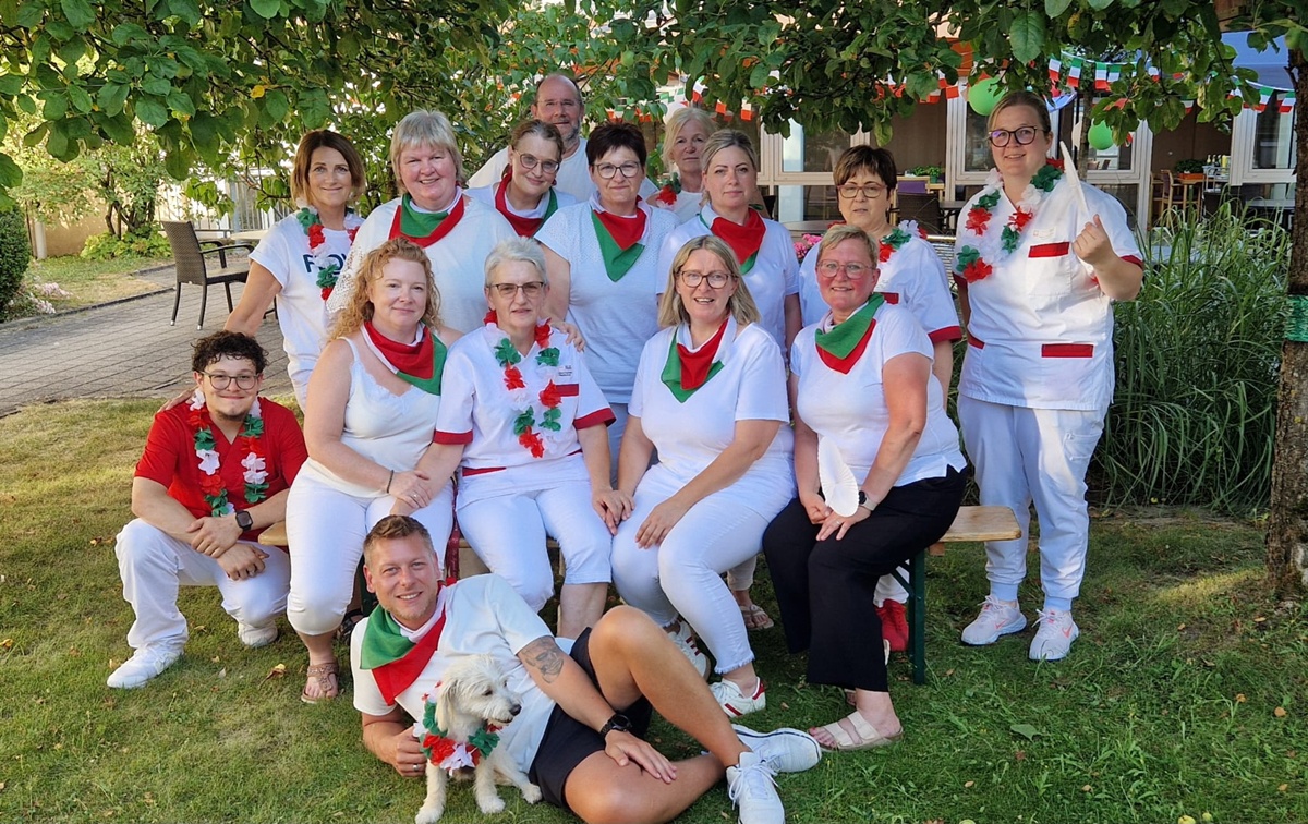 Die Gartenanlage des Seniorenheims war liebevoll in den italienischen Nationalfarben Rot, Weiß und Grün dekoriert. Auch das Team des Hauses zeigte sich passend zum Motto mit Halstüchern in den italienischen Farben. Heimleiterin Kathrin Schürner begrüßte die Bewohnerinnen und Bewohner herzlich und eröffnete das Fest bei herrlichem Sonnenschein, begleitet von Eiskaffee und hausgemachter Tiramisutorte.