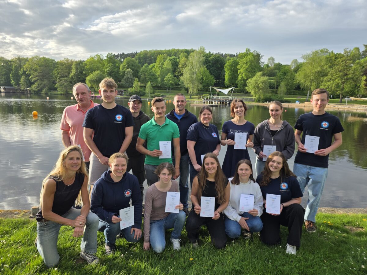 Im Anschluss an die Einführung in den Wachdienst freuten sich Hannelore Gugel und Christian Lohner an die anwesenden erfolgreichen Absolventen die Rettungsschwimmabzeichen samt Urkunde zu überreichen. Insgesamt wurde ein Abzeichen in Bronze, 23-mal Silber und siebenmal Gold absolviert. Fünf Teilnehmer errangen sogar Silber und Gold. Zur Feier des Tages schürte man den Grill an, und ließ den Abend am malerischen Rußweiher gemütlich ausklingen.