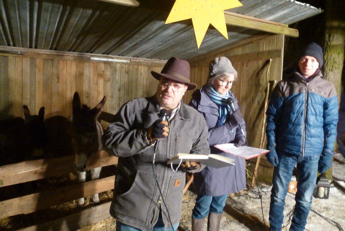 Hauptanziehungspunkt waren für die Kinder die Esel Molli und Charly im Stall von Bethlehem, die in Begleitung von Jutta Prößl und Jutta Hopf den einstündigen Weg von Hütten nach Kaltenbrunn und zurück auf sich genommen hatten. Hirten hielten Nachtwache um die Schafpferch. Der Posaunenchor unter Katrin Seidl spielte zur Einstimmung und begleitete auch das von Julia Crämer moderierte Krippenspiel zum Thema „Josef in Nöten“.