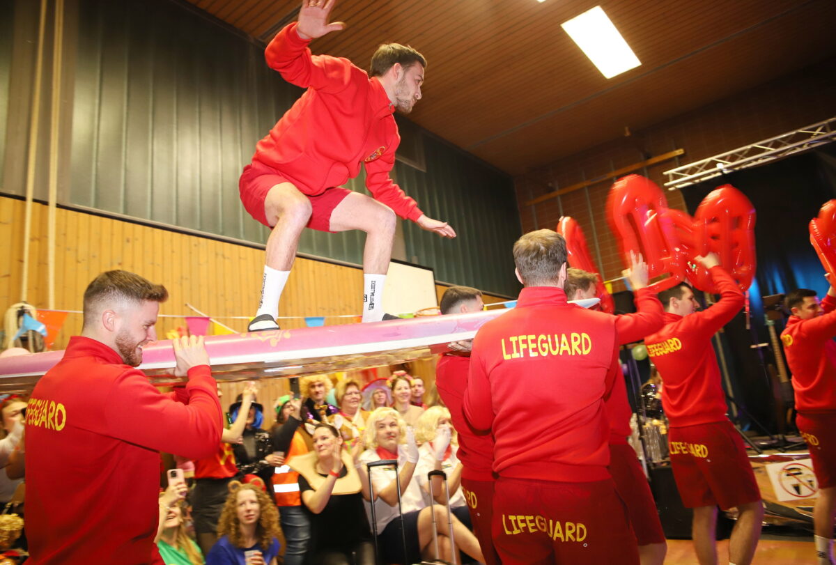 Das Show-Team mit gesetzterem Alter wurde von der Choreografie her ebenso das nachfolgende, die Kicker aus der Bezirksligaelf, von Maria Schiesl, Tanja Herrmann und Petra Konrad offenbar ideal vorbereitet. Verkleidet als „Lifeguard“ in baywatchrotem Outfit balancierte die Truppe ihren „Captain Andy“ mit einem Surfbrett gekonnt durch die Tanzfläche. Auch die Jungs bewiesen in der Folge bei ihren Tanzeinlagen reichlich Allroundertalent und viel Fantasie.