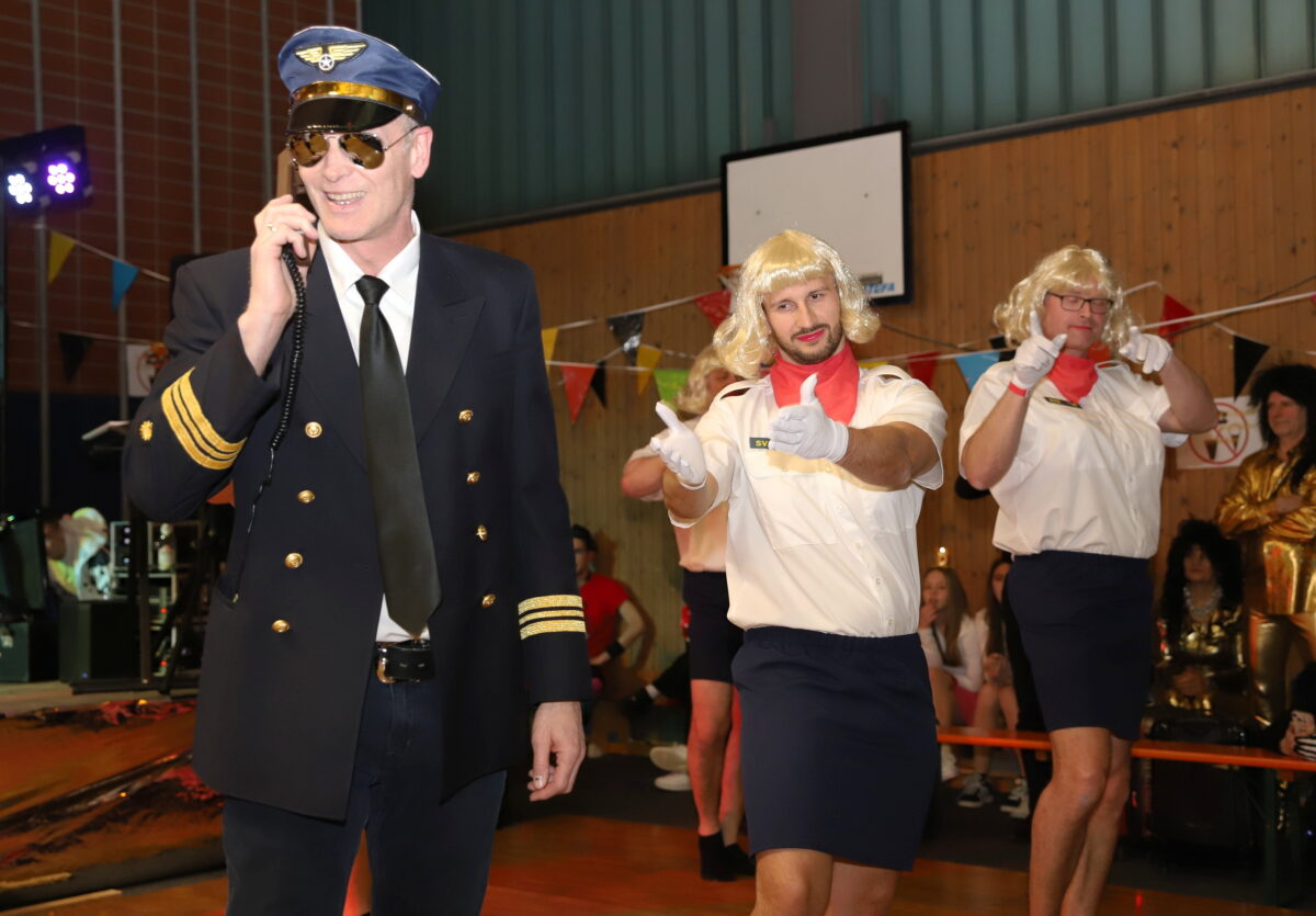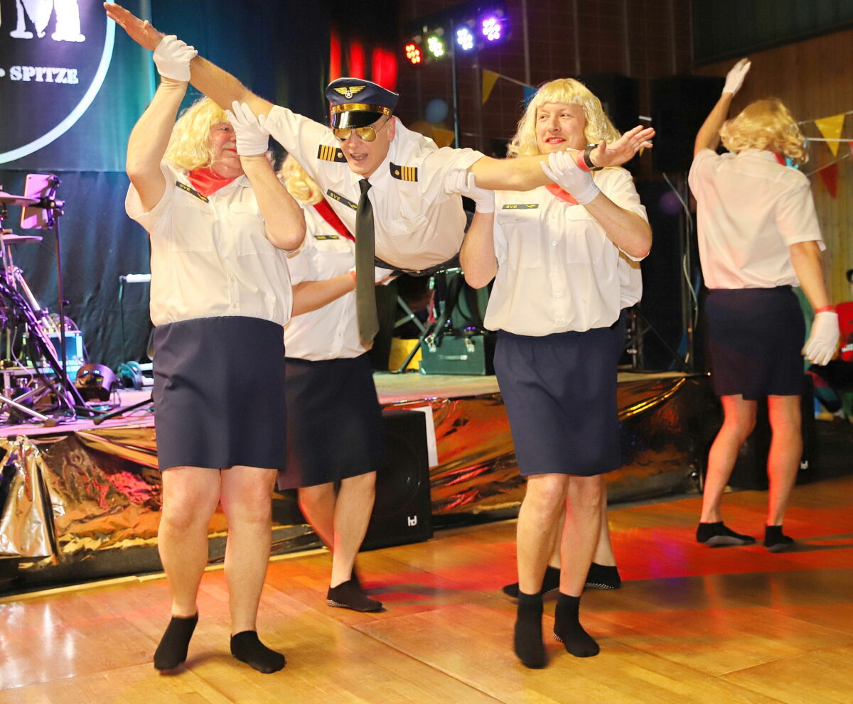 Kontrast im Programm vor Mitternacht schufen die schon traditionellen Auftritte von zwei nach Alters- und Gewichtsklassen aufgestellten Showtanzgruppen des Sportvereins – alles Männer, aktive und passive Fußballer. „Der Flug in die Karibik“ kann man den ersten Part, den Flugkapitän Andreas Paul in einer Paraderolle eröffnete, überschreiben. In dezenter Stewardesskleidung, kräftig geschminkt, untermalt von Reinhard Meys „Über den Wolken“ entwickelten die teils vollschlanken „DarstellerInnen“ ungeahnte tänzerische Fähigkeiten.