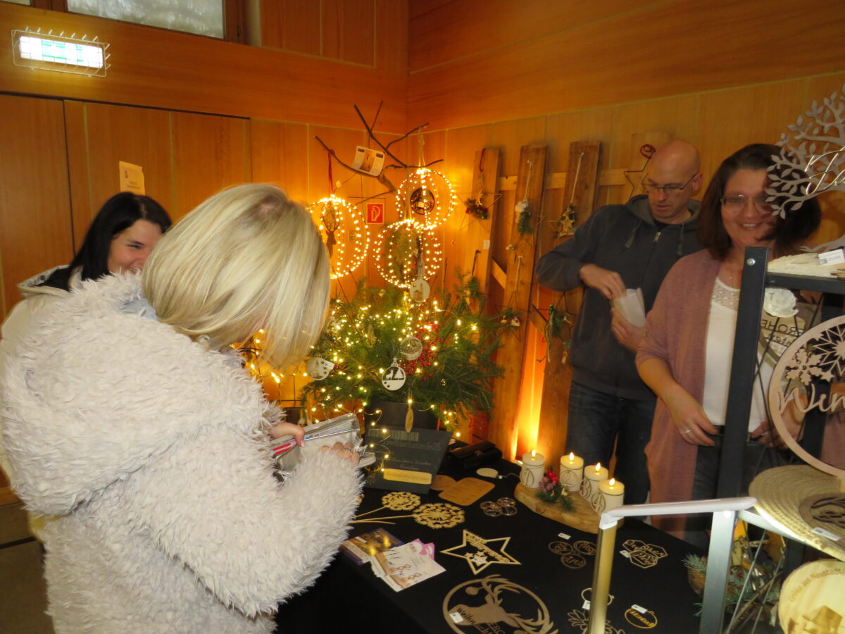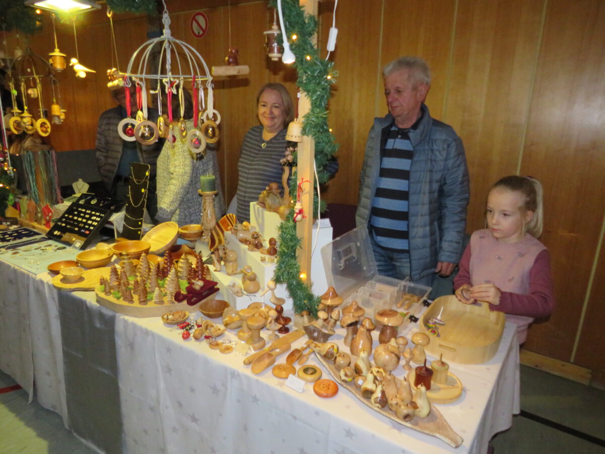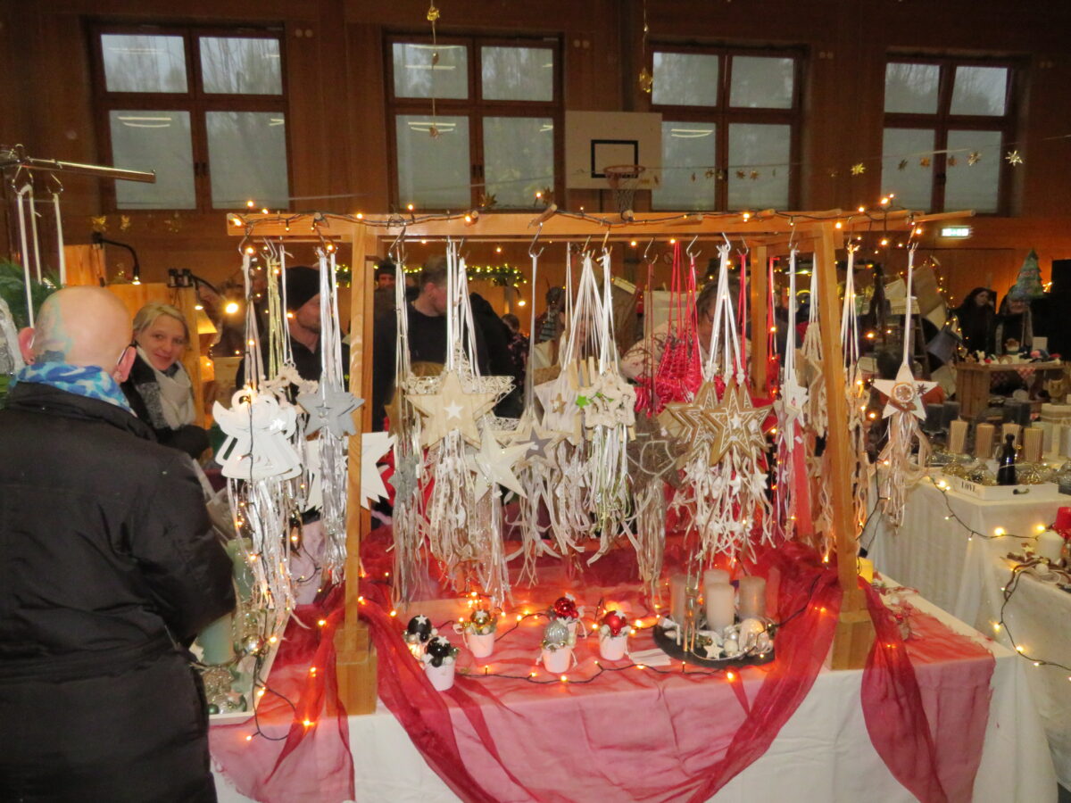 Die Besucher konnten sich der vorweihnachtliche Stimmung nicht entziehen, wenn sie am Samstag und Sonntag die Räume im Gemeindezentrum betraten. In der Turnhalle, auf den Gängen und allen möglichen Ecken, konnten die Besucher wunderschöne meist handgefertigte Artikeln bewundern. Es war ganz natürlich, dass viele der selbstgefertigten Unikate über die Tische der Stände in den Besitz der Weihnachtsmarktbesucher übergingen. Beim Betreten der Turnhalle umwehte der weihnachtliche Flair die Besucher. Viele der angebotenen Artikel erinnert an das bevorstehende Weihnachtsfest. selbstgefertigte Advents- und Weihnachtsdekoration fanden die Aufmerksamkeit der Betrachter. Holzarbeiten, Stickereien, Metalldeko, Näharbeiten, Strick- und Häkelarbeiten, Betonarbeiten, Puppenkleider aber auch Töpferarbeiten, Naturkränze, Perlmuttschmuck, Drechselkunst, Kräuterspezialitäten und vieles mehr.