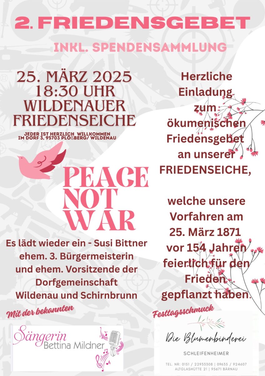 “Alle sind herzlich willkommen, auch Menschen außerhalb von Wildenau – unabhängig von Alter oder Konfession”, betont Bittner, die schon im vergangenen Jahr ein Friedensgebet am gleichen Ort für die Ukraine veranstaltete. Diesmal geht es um den Frieden auf der ganzen Welt, der bedrohter sei denn je. Unter dem von der Blumenbinderei Altglashütte geschmückten Eiche wird Bettina Mildner Lieder singen unter dem Motto “Frieden für die Welt und Bewahrung der Schöpfung”.