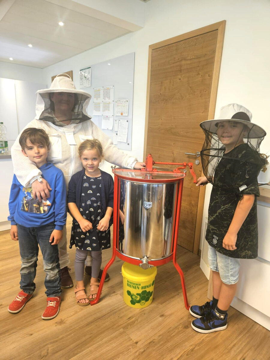 Besonderes Interesse weckte die zahlreiche mitgebrachte Imkerausrüstung, vom Smoker über Honigwaben, eine Weiselzelle und verschiedene Arbeitsgeräte bis hin zur Honigschleuder. Begleitet wurde Tanja von ihrem Mann Karl sowie den Kindern Moritz, Maximilian, Marlene und Marie. „Vor allem Moritz zeigt bereits große Begeisterung für die Imkerei und unterstützt seinen Vater jeden Abend beim Füttern der Bienen“, meinte die junge Imkerin.