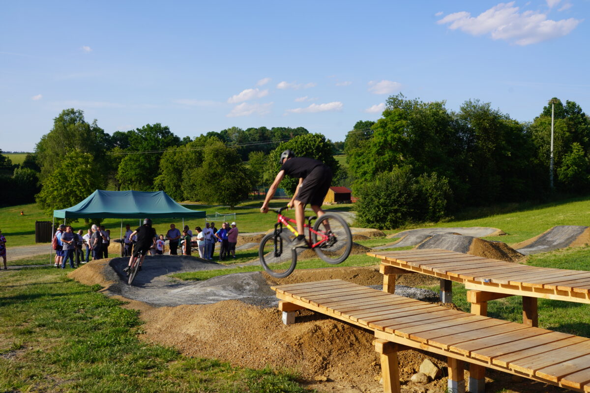 Einige junge Bikesportler probierten die Anlage im Beisein der Gäste wie dem Flossenbürger Bürgermeister Thomas Meiler, dem Flosser Rathauschef Robert Lindner und Drittem Bürgermeister Ewald Zetzl aus Waidhaus aus.