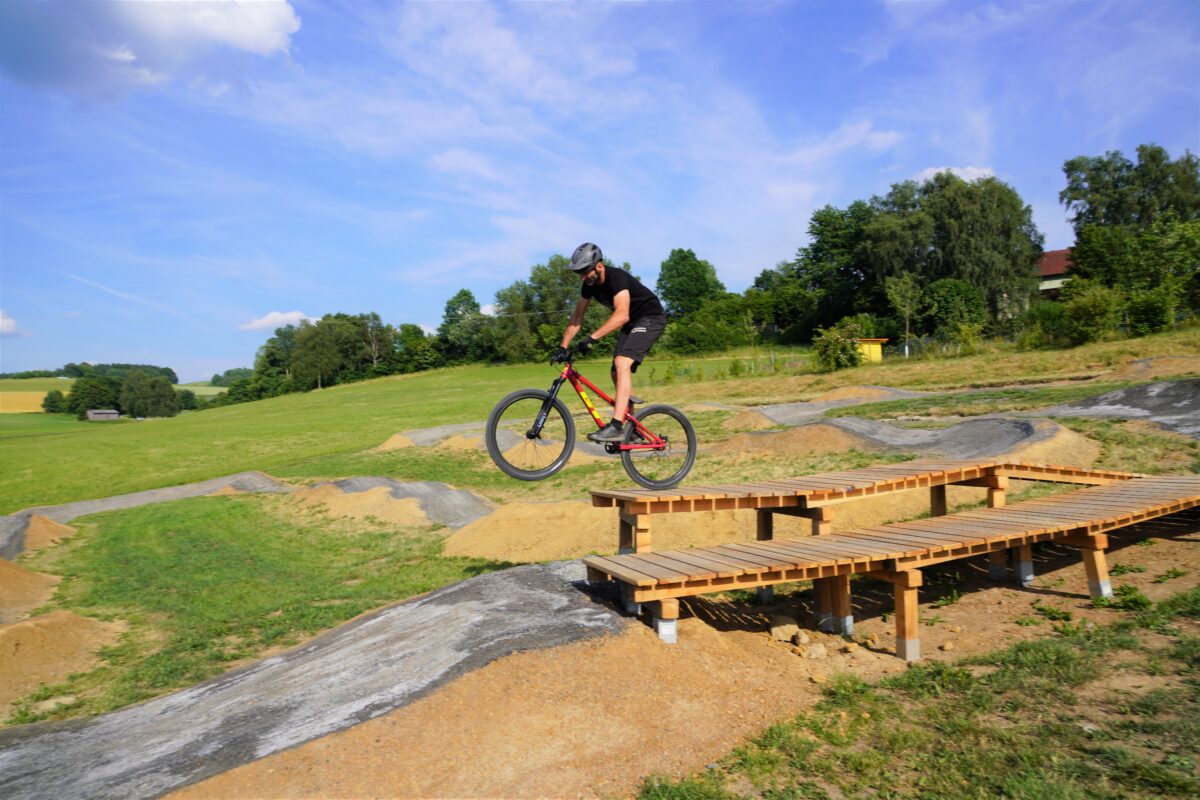 Im Bikepark sind auch große und kleine Sprünge, sogenannte Drops – Stufen eingebaut. Man bietet hier zwei Bereiche, um möglichst viele Mountainbiker abzuholen. Unten ist der sogenannte Pumptrack, eine Wellenbahn, auf das Ziel sein sollte, allein durch Wellenbewegungen den Körper durch Drücken und Ziehen in einer kontinuierlichen Bewegung zu halten.