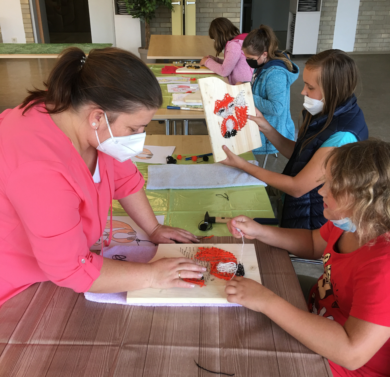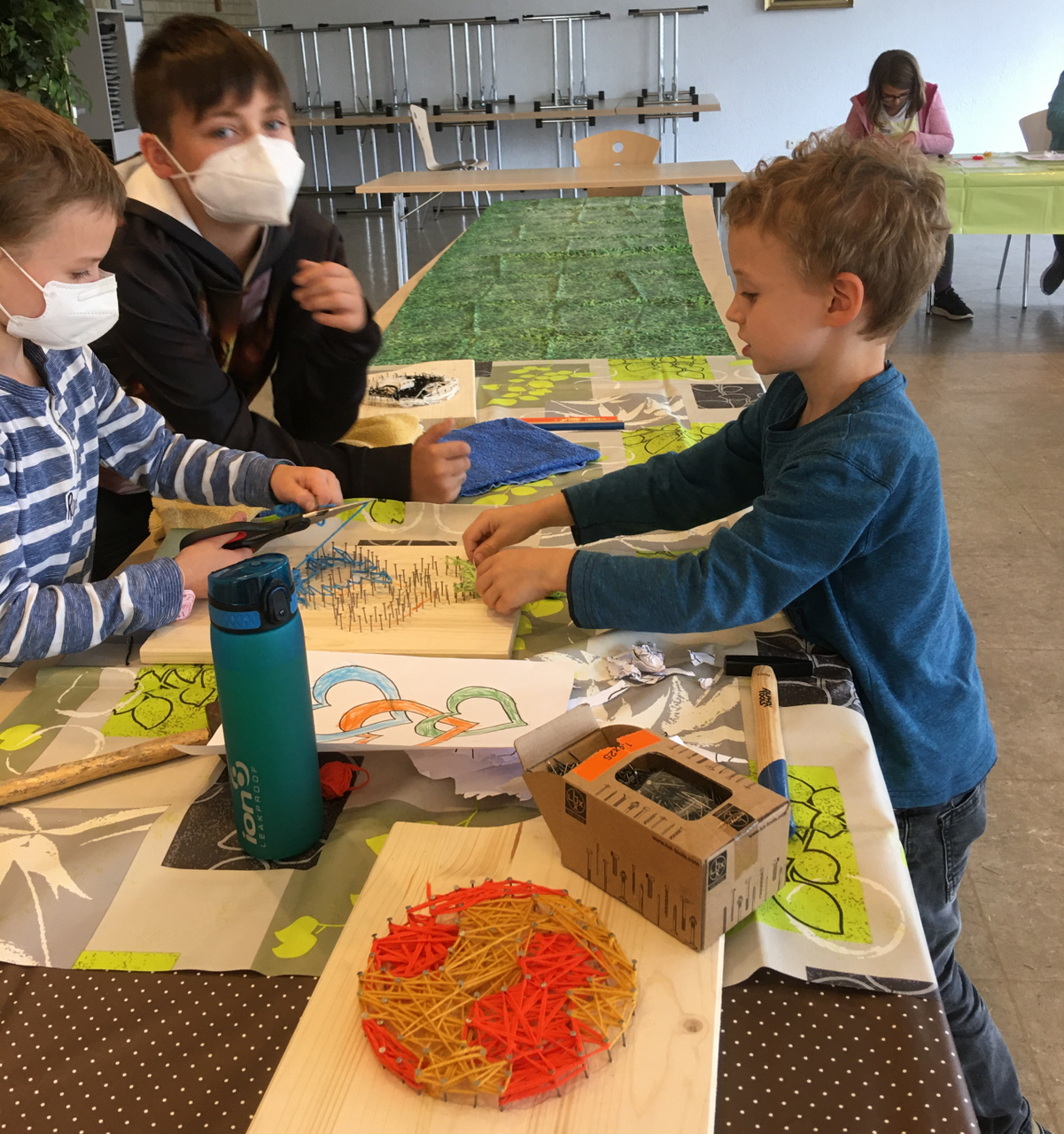 Das gleiche Motiv haben sie im Anschluss auf ein Brett gelegt und ringsherum Nägel eingeschlagen. Danach wickelten die Kinder Wolle um die Nägel und nach kurzer Zeit war das Kunstwerk vollendet. Agnes Zirngibel war an diesem Veranstaltungstag sowohl für die Durchführung als auch Betreuung verantwortlich.