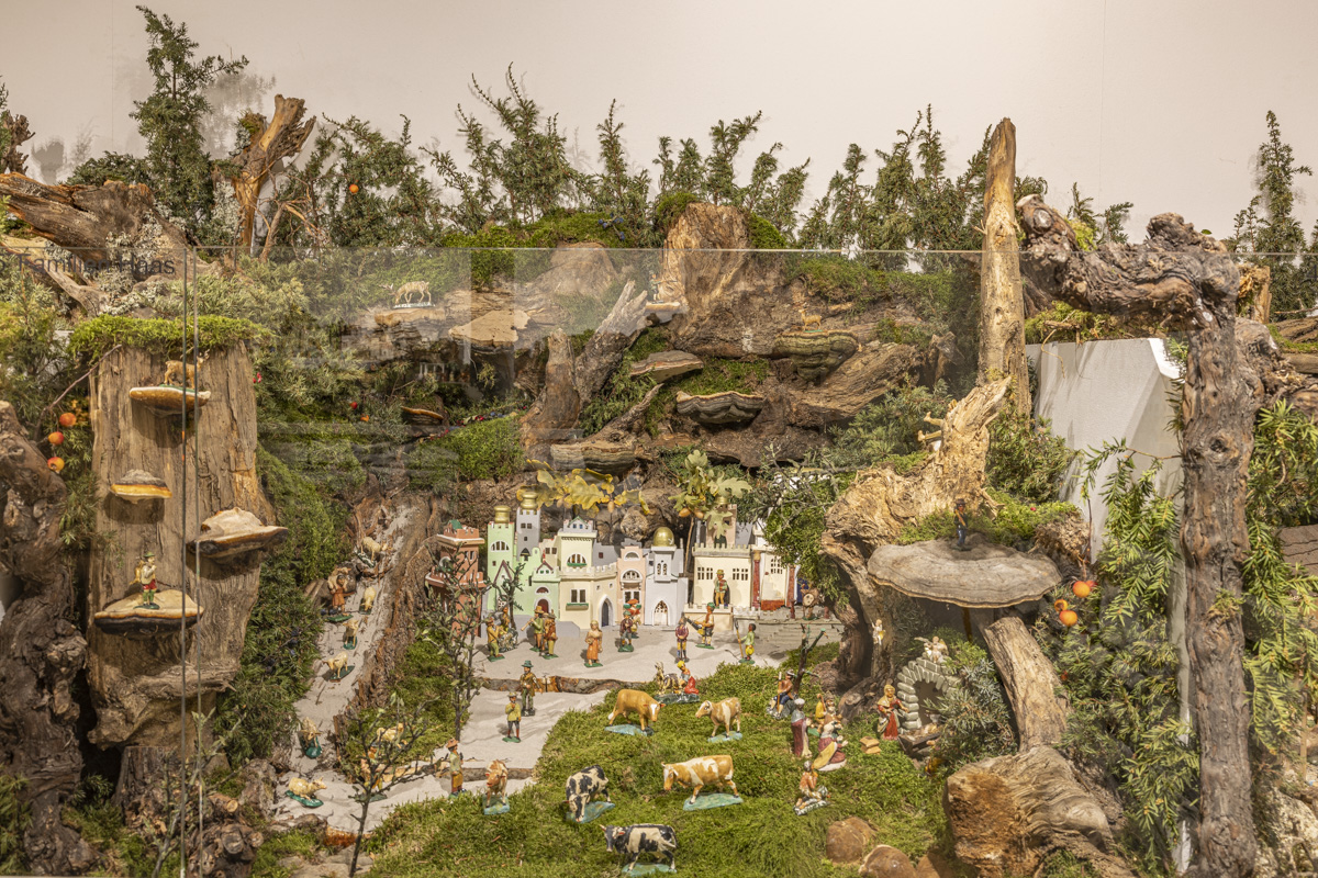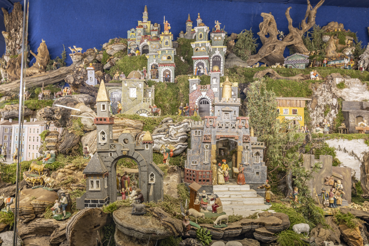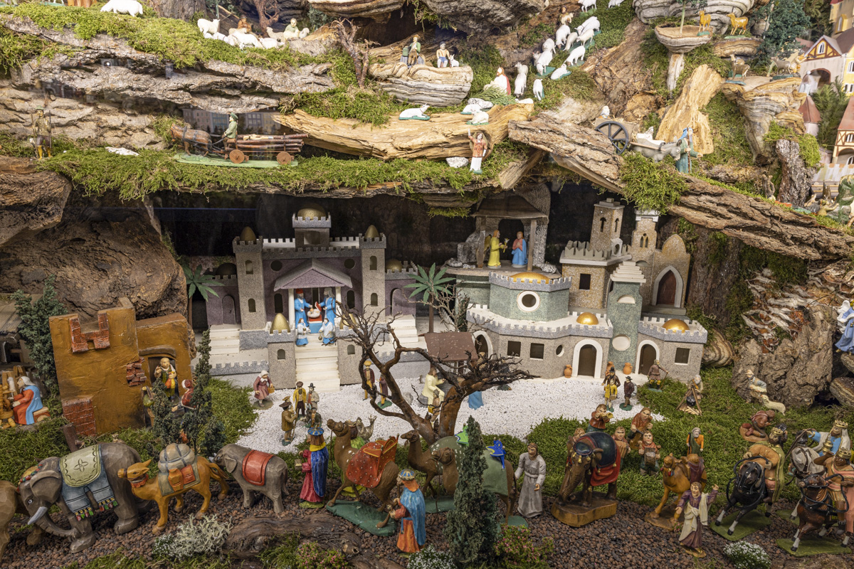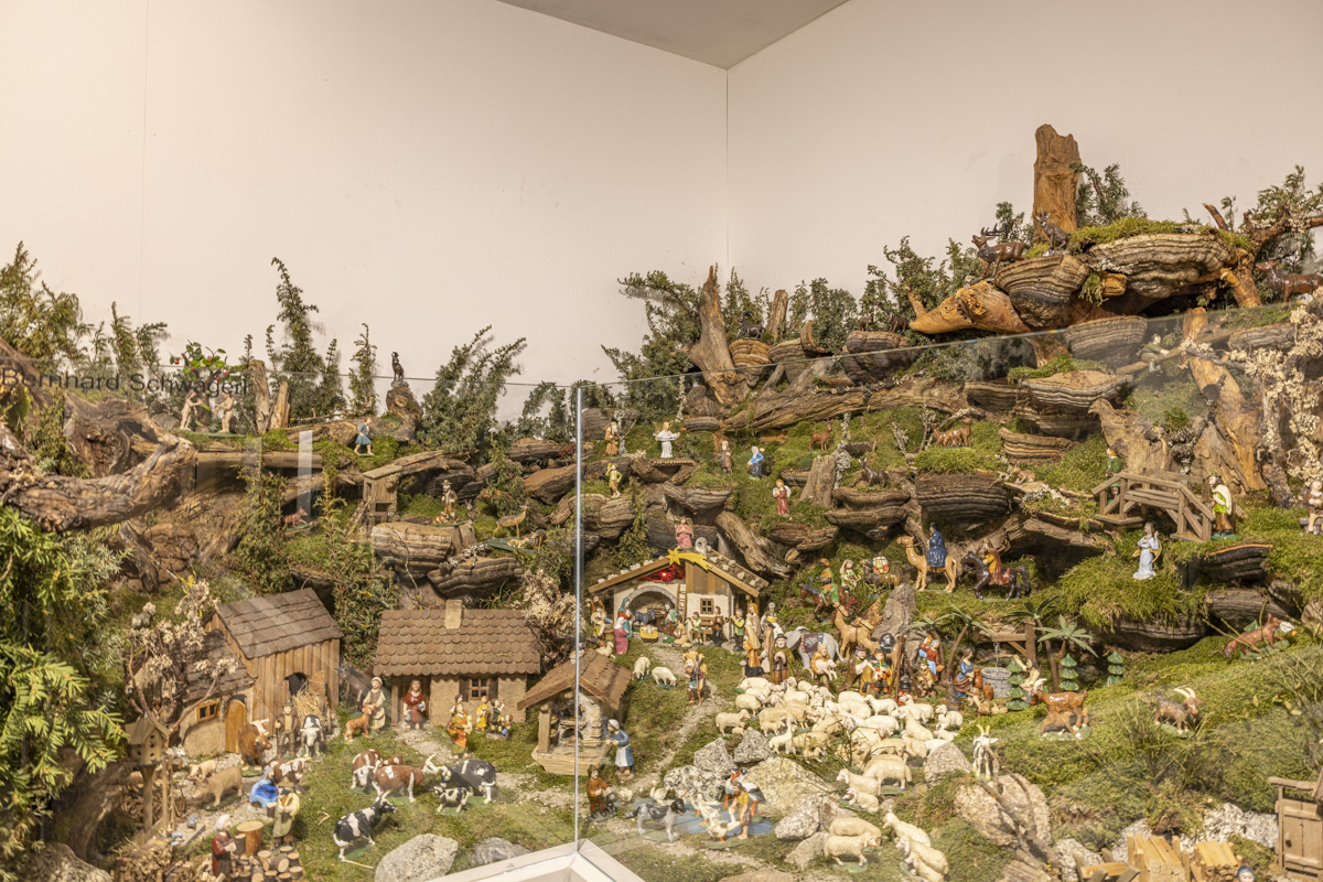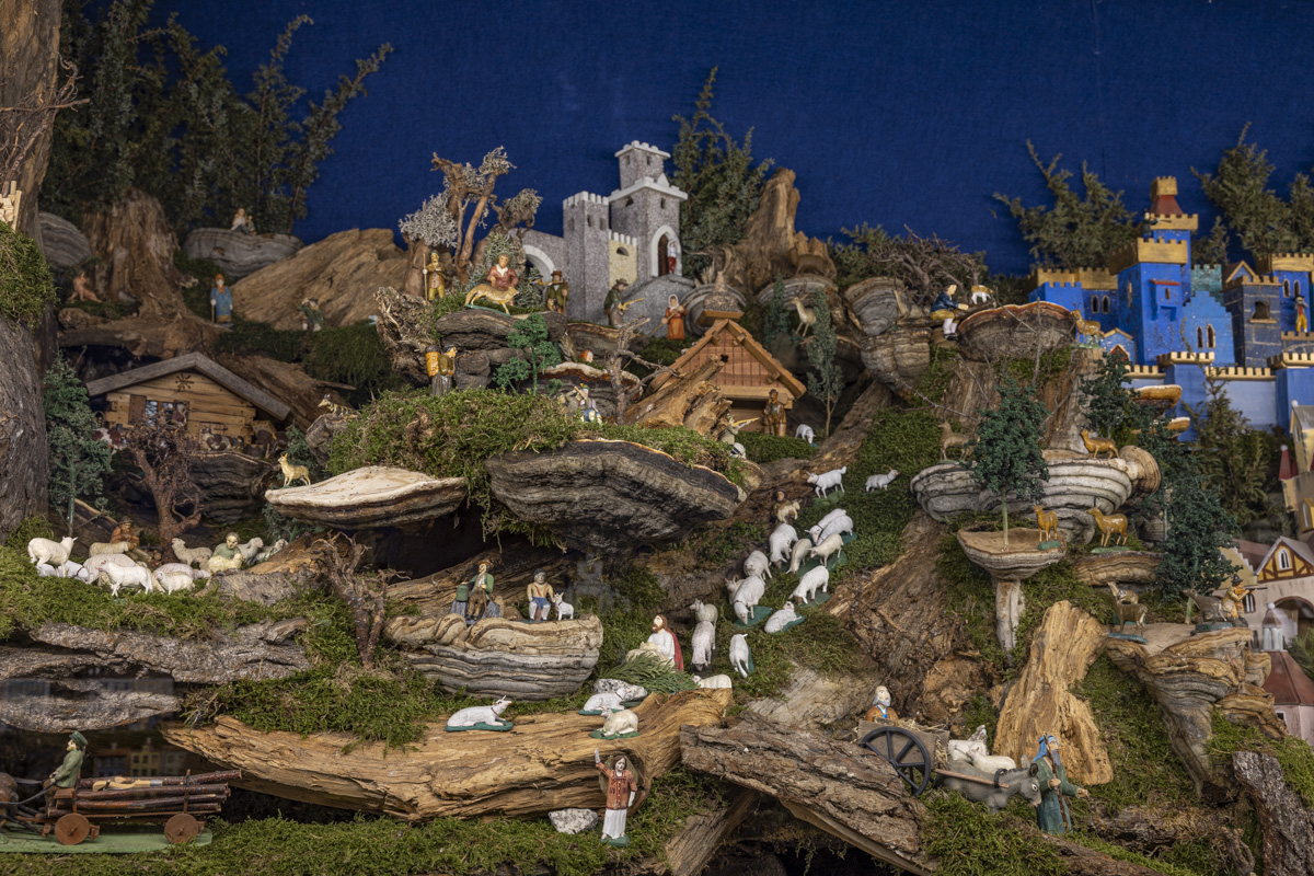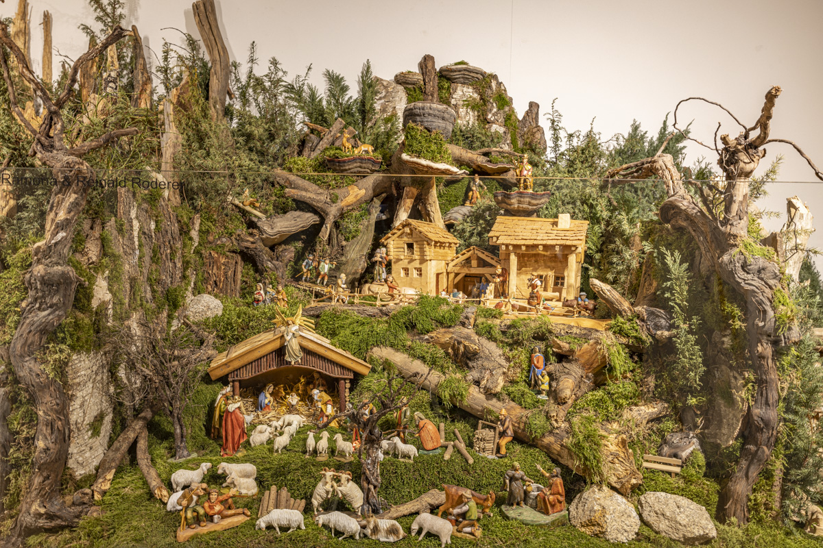 20 Kubikmeter Holz sowie 3000 Quadratmeter Spanplatten wurden mit Wurzeln, Baumpilzen, Steinmoos und Granit zu einer gigantischen Kulisse verarbeitet. Dort fanden 8000 Krippenfiguren und zahlreiche historischen Gebäuden ein neues Zuhause. Eine Szenerie, an der man sich kaum sattsehen kann. Zwei Wege führen rechts und links nach Bethlehem. Mehr als 3000 Stunden (125 Tage) ehrenamtliche Arbeit wurden alleine in die Kulisse dieses Großprojekts investiert.