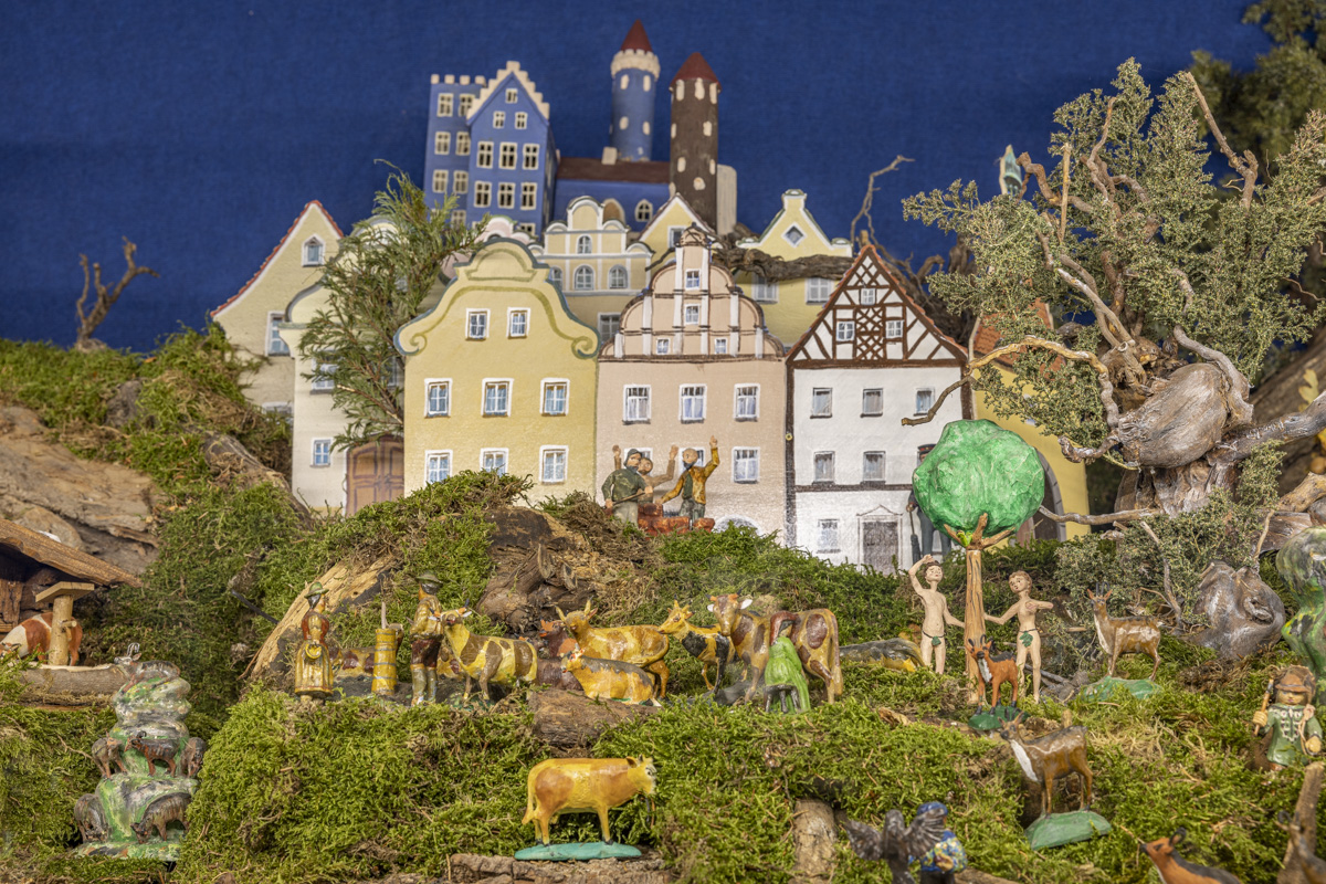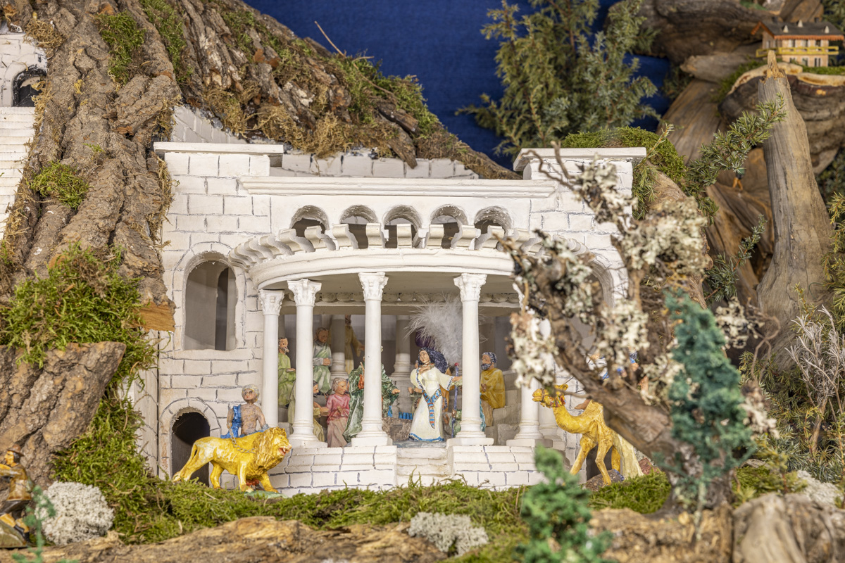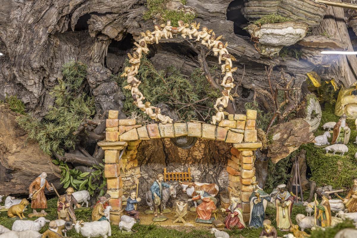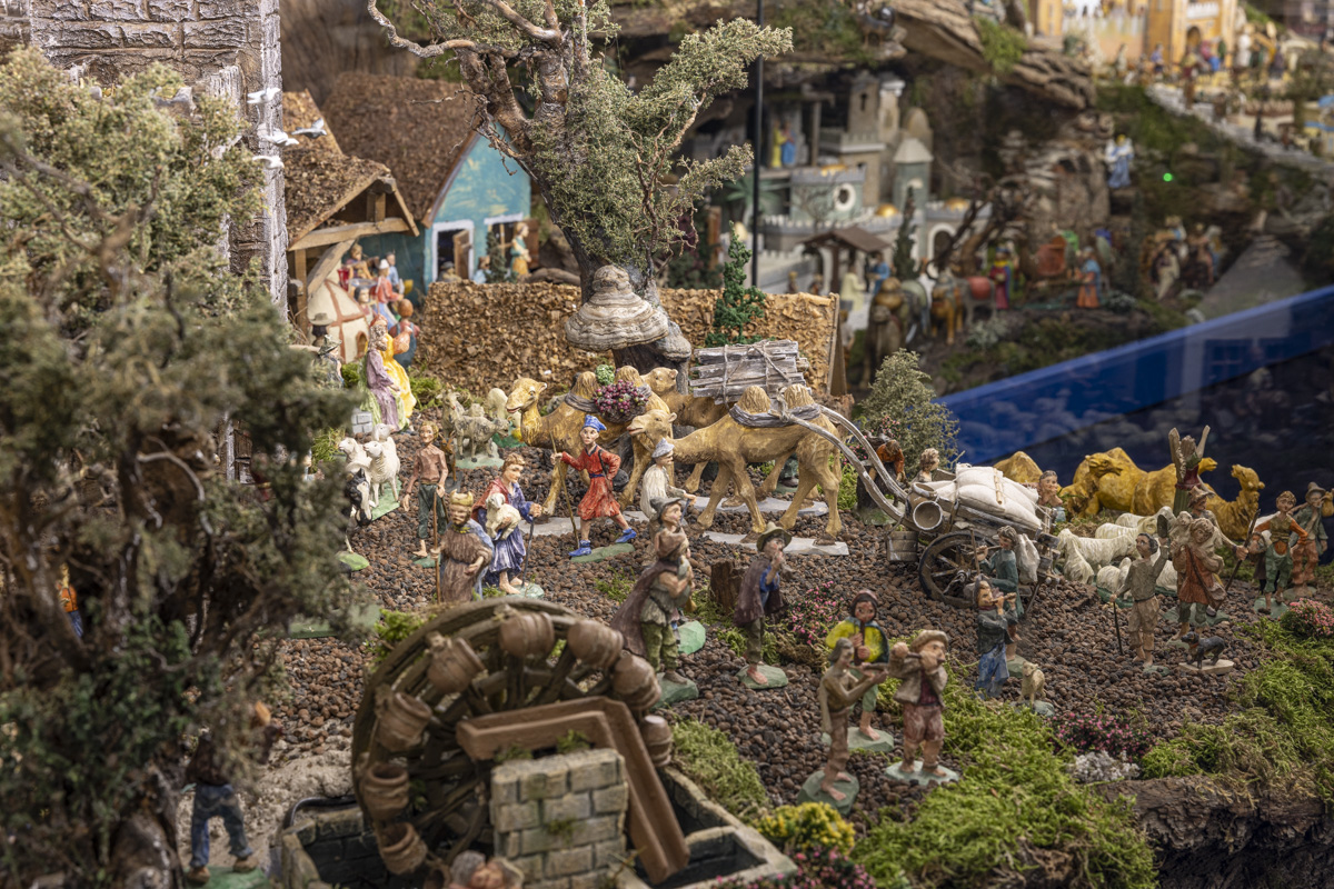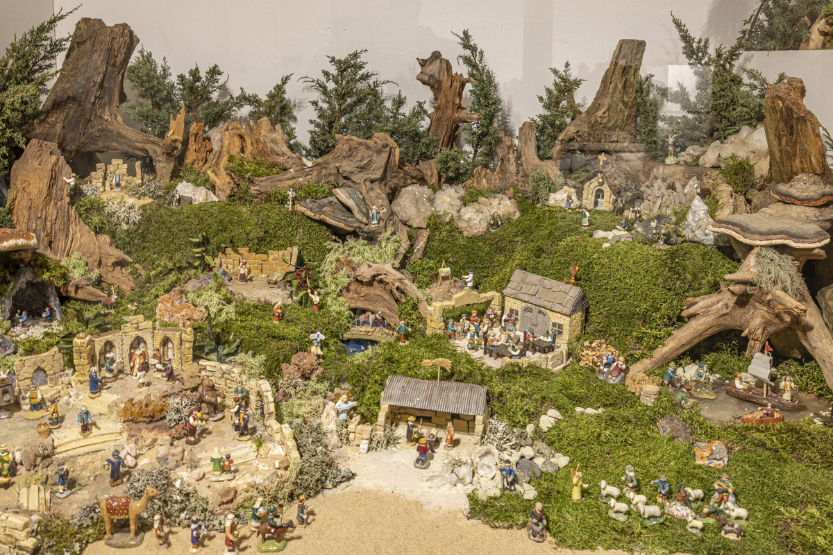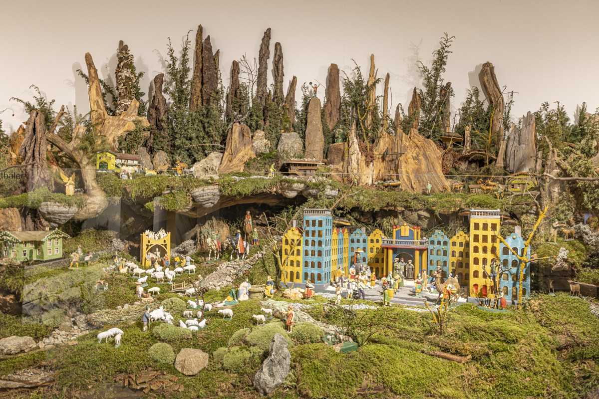 20 Kubikmeter Holz sowie 3000 Quadratmeter Spanplatten wurden mit Wurzeln, Baumpilzen, Steinmoos und Granit zu einer gigantischen Kulisse verarbeitet. Dort fanden 8000 Krippenfiguren und zahlreiche historischen Gebäuden ein neues Zuhause. Eine Szenerie, an der man sich kaum sattsehen kann. Zwei Wege führen rechts und links nach Bethlehem. Mehr als 3000 Stunden (125 Tage) ehrenamtliche Arbeit wurden alleine in die Kulisse dieses Großprojekts investiert.