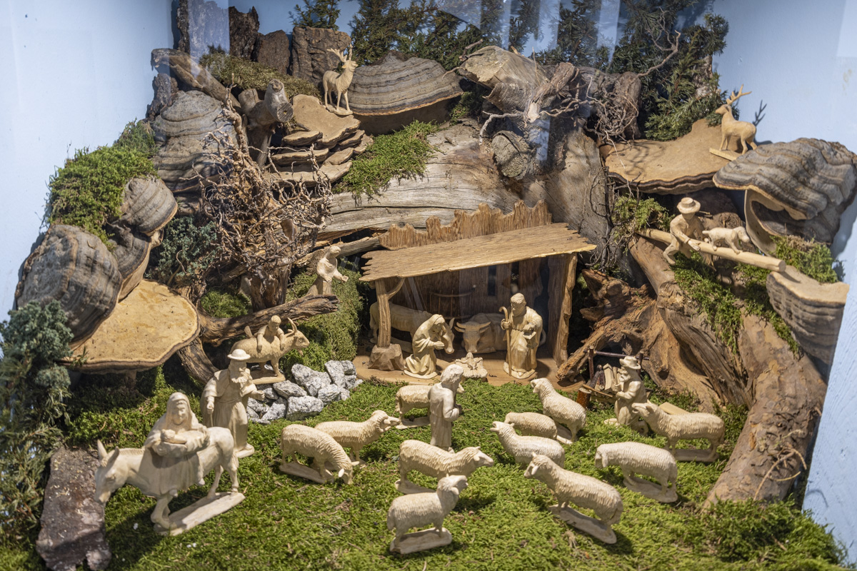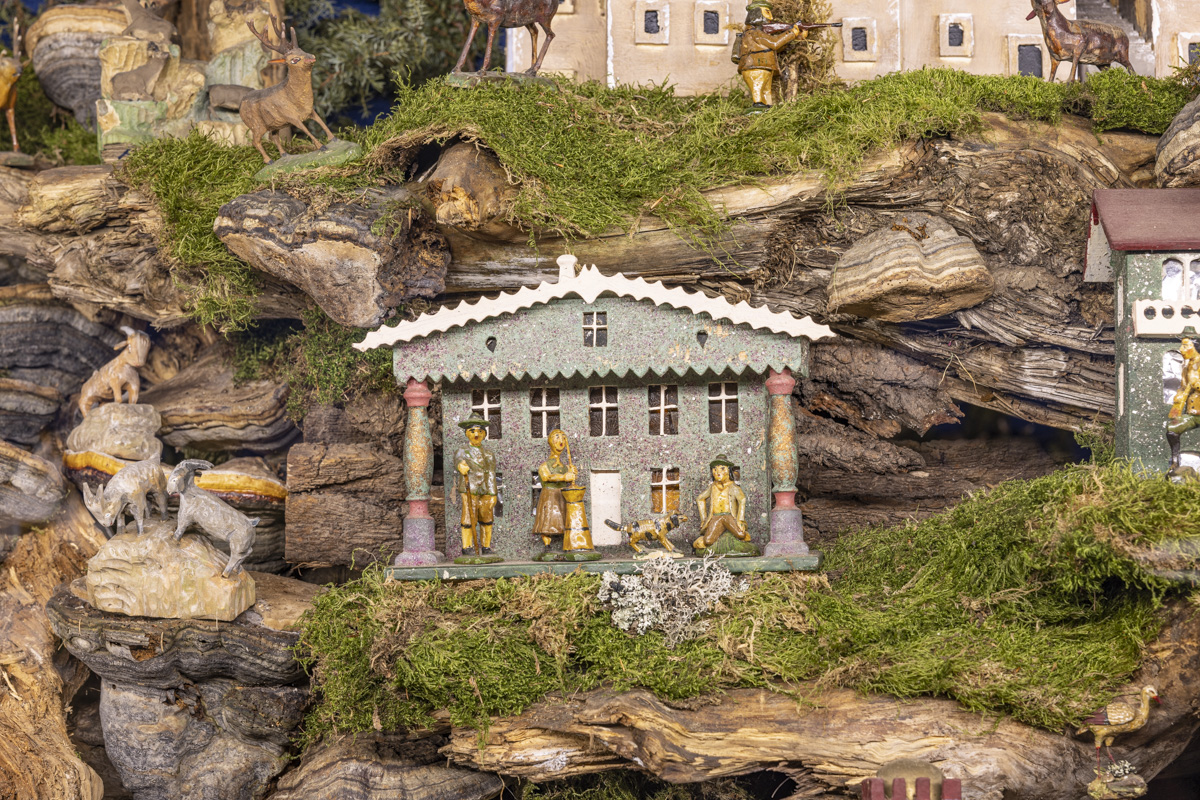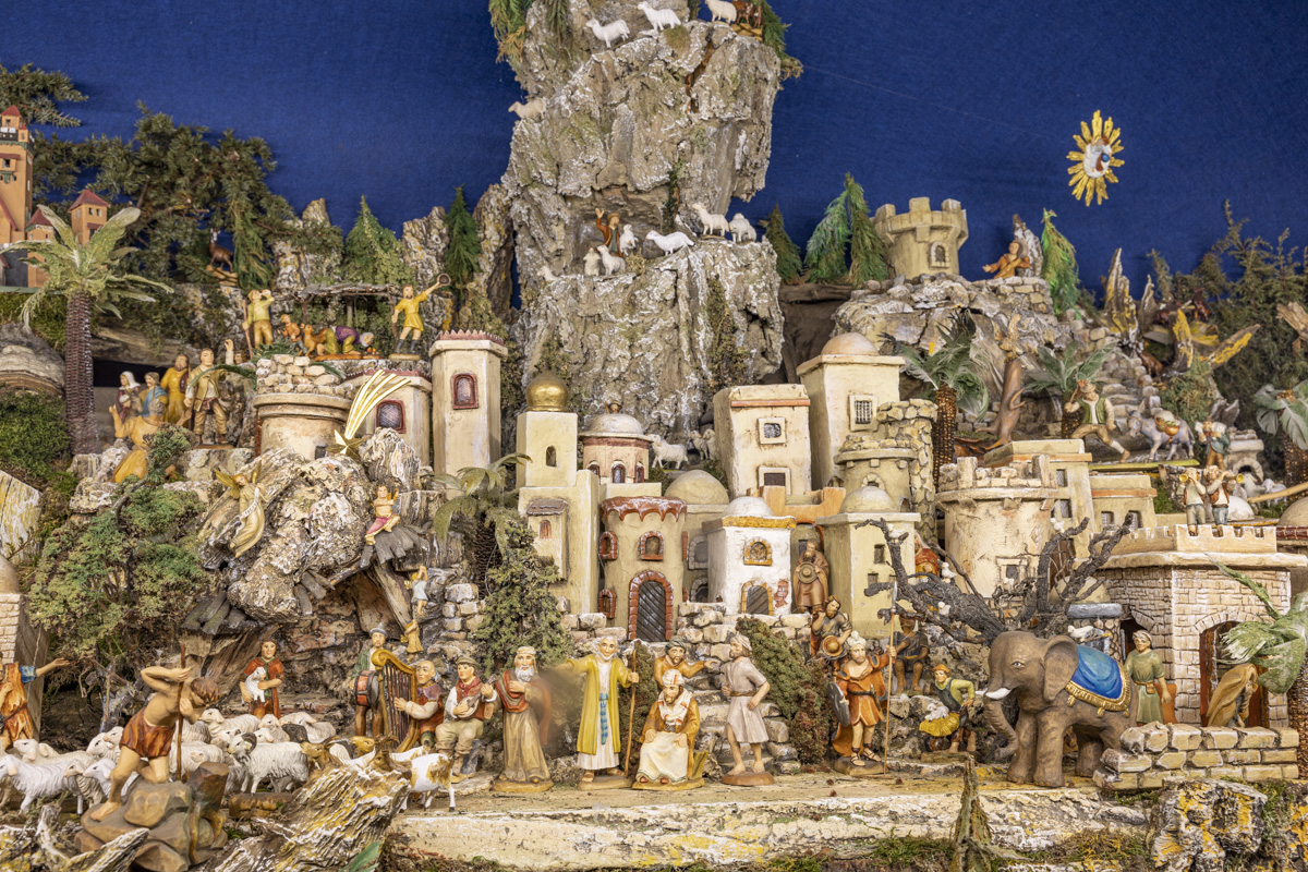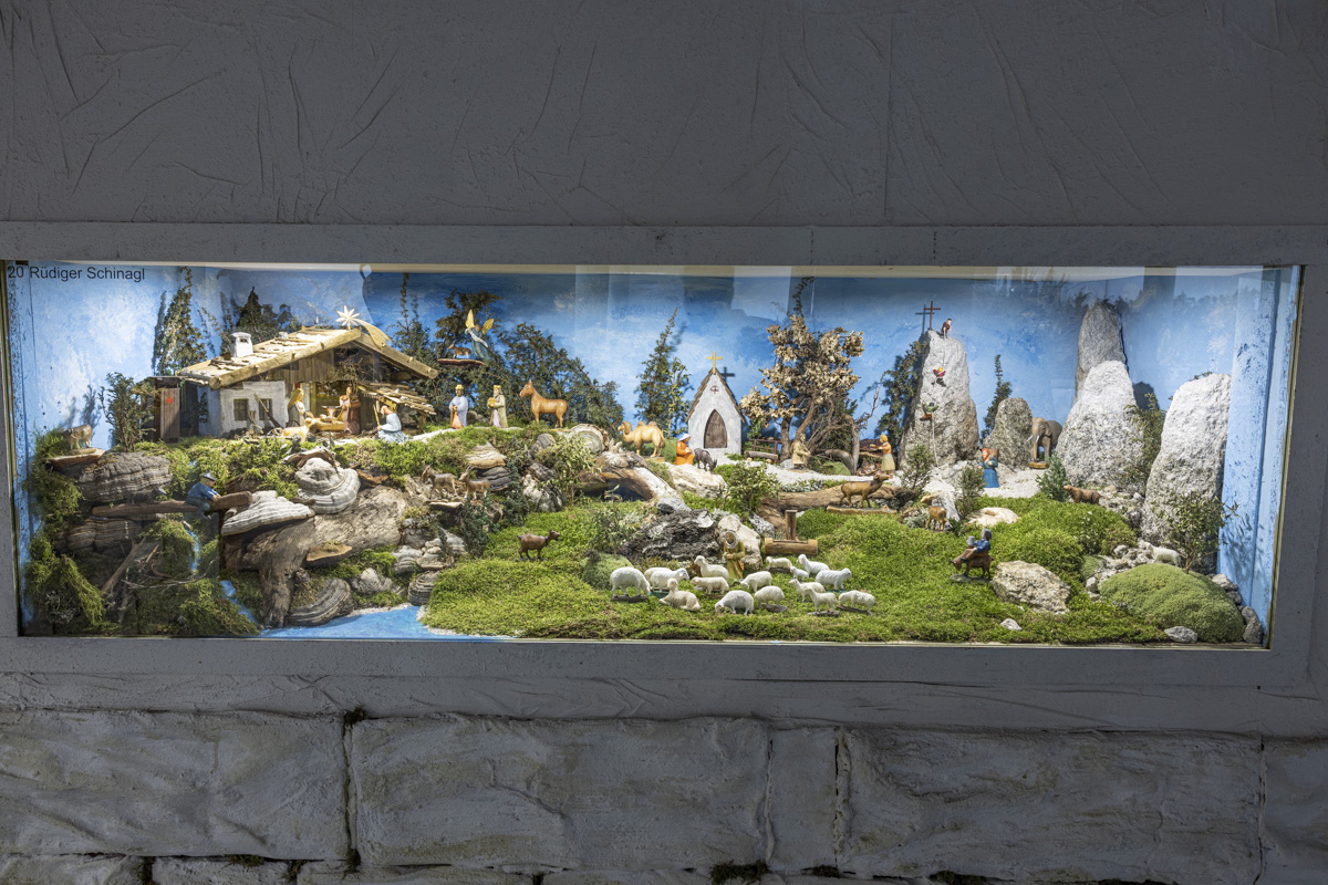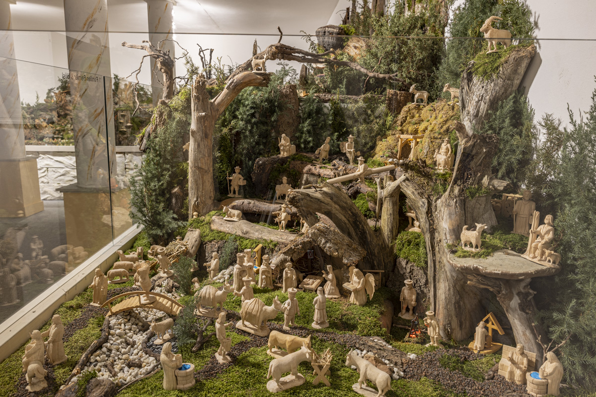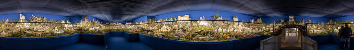 20 Kubikmeter Holz sowie 3000 Quadratmeter Spanplatten wurden mit Wurzeln, Baumpilzen, Steinmoos und Granit zu einer gigantischen Kulisse verarbeitet. Dort fanden 8000 Krippenfiguren und zahlreiche historischen Gebäuden ein neues Zuhause. Eine Szenerie, an der man sich kaum sattsehen kann. Zwei Wege führen rechts und links nach Bethlehem. Mehr als 3000 Stunden (125 Tage) ehrenamtliche Arbeit wurden alleine in die Kulisse dieses Großprojekts investiert.