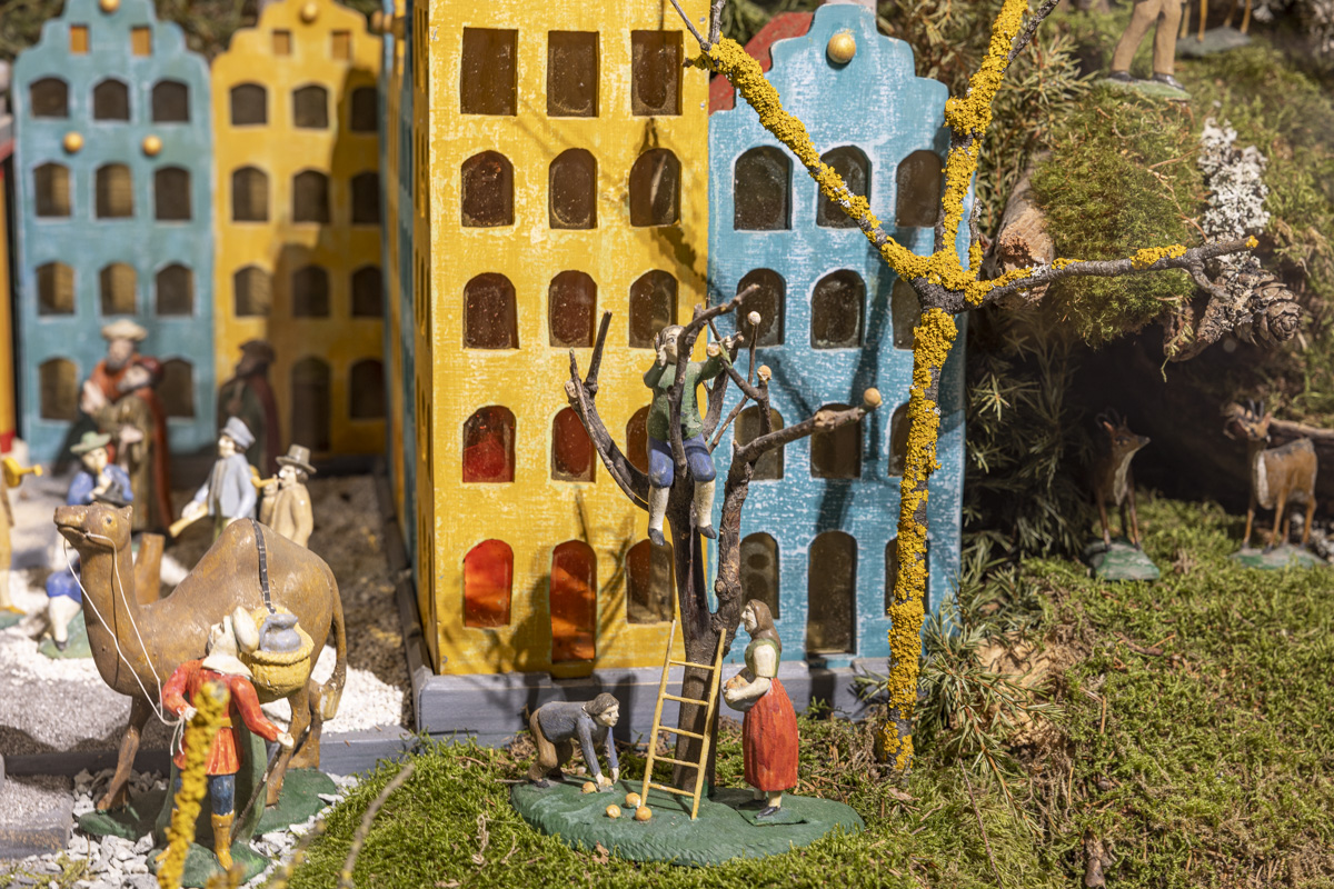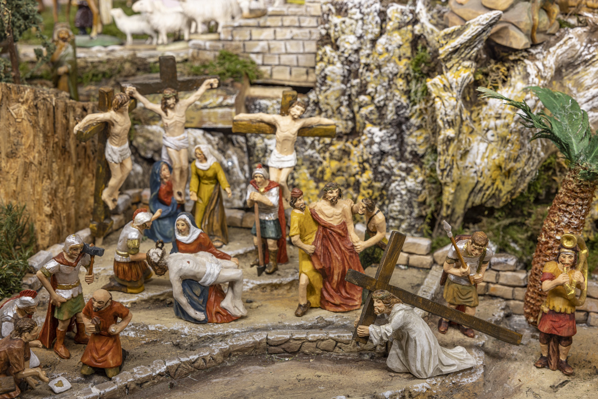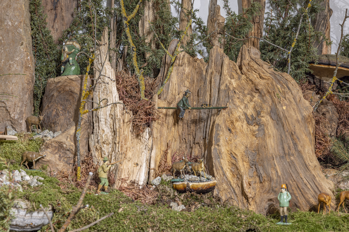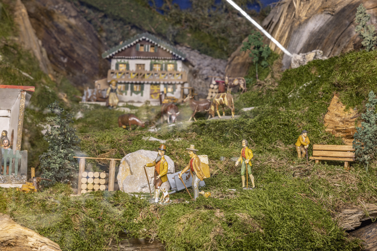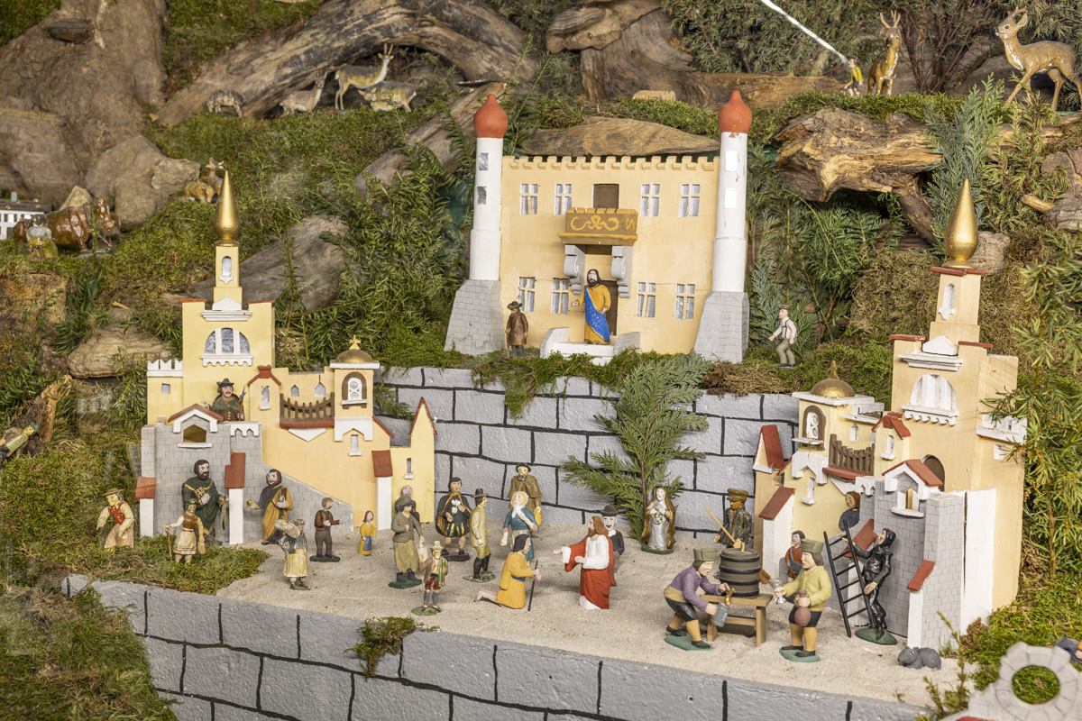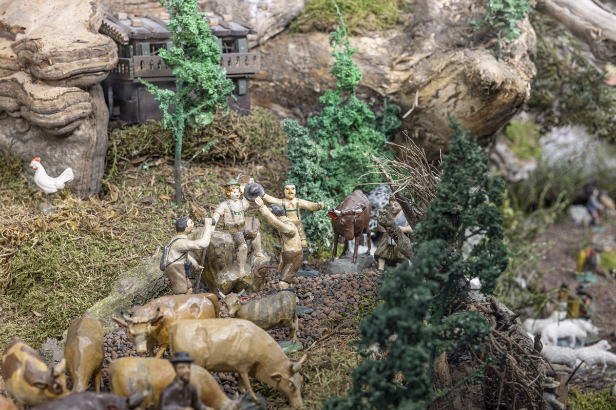 20 Kubikmeter Holz sowie 3000 Quadratmeter Spanplatten wurden mit Wurzeln, Baumpilzen, Steinmoos und Granit zu einer gigantischen Kulisse verarbeitet. Dort fanden 8000 Krippenfiguren und zahlreiche historischen Gebäuden ein neues Zuhause. Eine Szenerie, an der man sich kaum sattsehen kann. Zwei Wege führen rechts und links nach Bethlehem. Mehr als 3000 Stunden (125 Tage) ehrenamtliche Arbeit wurden alleine in die Kulisse dieses Großprojekts investiert.