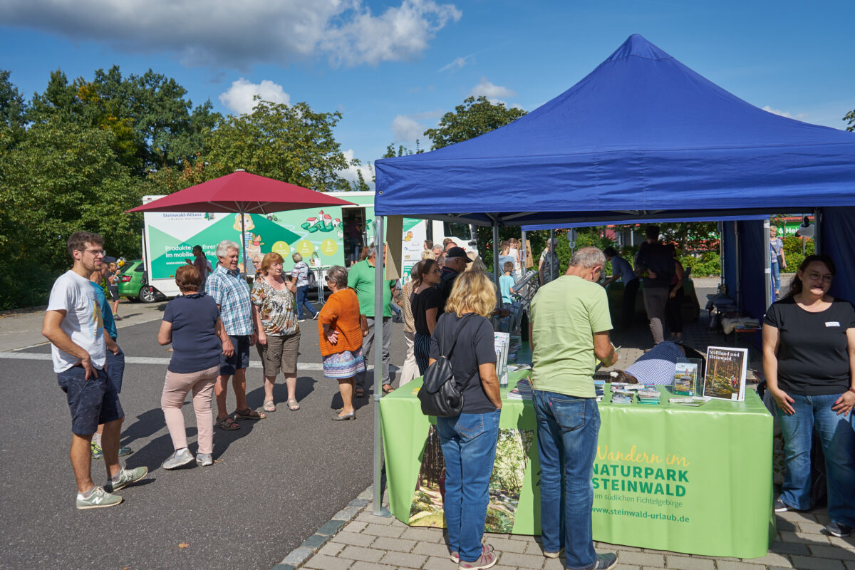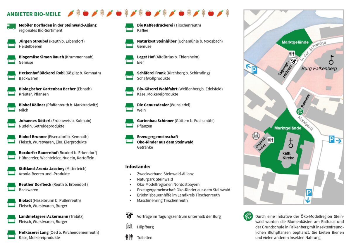 Von 11 Uhr bis 17 Uhr bieten mehr als 20 Bio-Direktvermarkter eine breite Palette ihrer Waren an: Dazu gehören unter anderem Backwaren, Gemüse, Nudeln, Käse, Steinwald-Rinderburger, Steinwald-Mohngebäck, Kräuter, Pflanzen, Beeren, Wurst, Wein, Wachteleier, Kaffee einer regionalen Rösterei und vieles mehr – natürlich alles rein biologisch. “Bio ist ausdrücklich vorgeschrieben. Sonst dürften wir das Ganze ja nicht Bio-Meile nennen”, erläutert Elisabeth Waldeck, Managerin der Ökomodellregion Steinwald. Präsentiert werden auch der Mobile Dorfladen der Steinwald-Allianz oder Infostände von Partnern der Ökomodellregion wie die Erzeugergemeinschaft Öko-Rinder und des Naturparks Steinwalds. Auch die insektenfreundlichen Blumenkästen von Modellregion-Mitarbeiterin Eva Gibhardt sind am Rathaus zu bewundern.