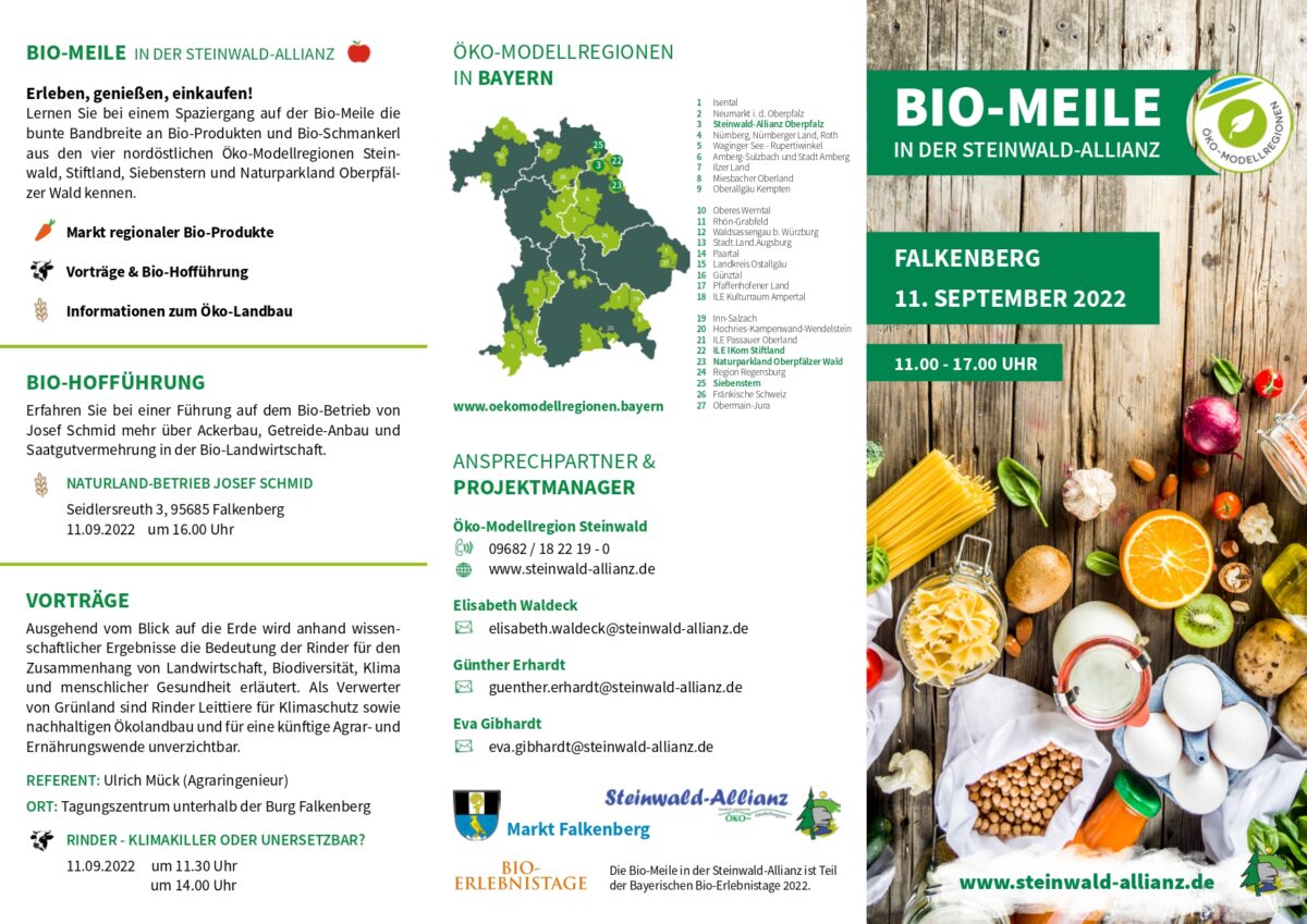 Im Februar 2022 beschlossen die Bürgermeister der Steinwald-Allianz, die 2021 erstmals veranstaltete “Bio-Meile in der Steinwald-Allianz” in eine zweite Runde gehen zu lassen. Falkenbergs Bürgermeister Matthias Grundler hatte sich bereits einen Tag nach der 1. Bio-Meile in Erbendorf für die Austragung in seinem Ort beworben und auch den Zuschlag bekommen.