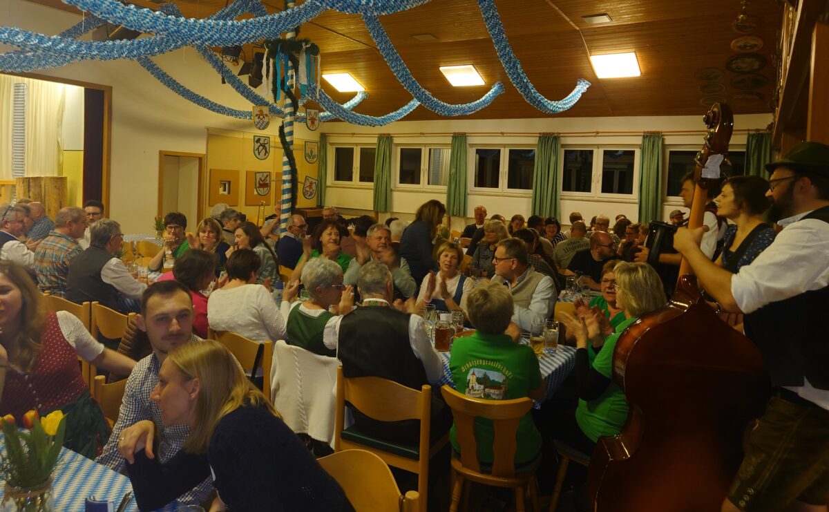 Käse- und Wurstbrotzeiten, von den Schützendamen frisch zubereitet und liebevoll serviert, galten bei den Gästen als willkommene Grundlage. Die fröhliche Atmosphäre im weiß-blau geschmückten Schützensaal wurde musikalisch von den Geschwistern Baier unterstutzt. Von Tisch zu Tisch wurden Lieder zum Mitschunkeln und passende Trinksprüche zum Besten gegeben.