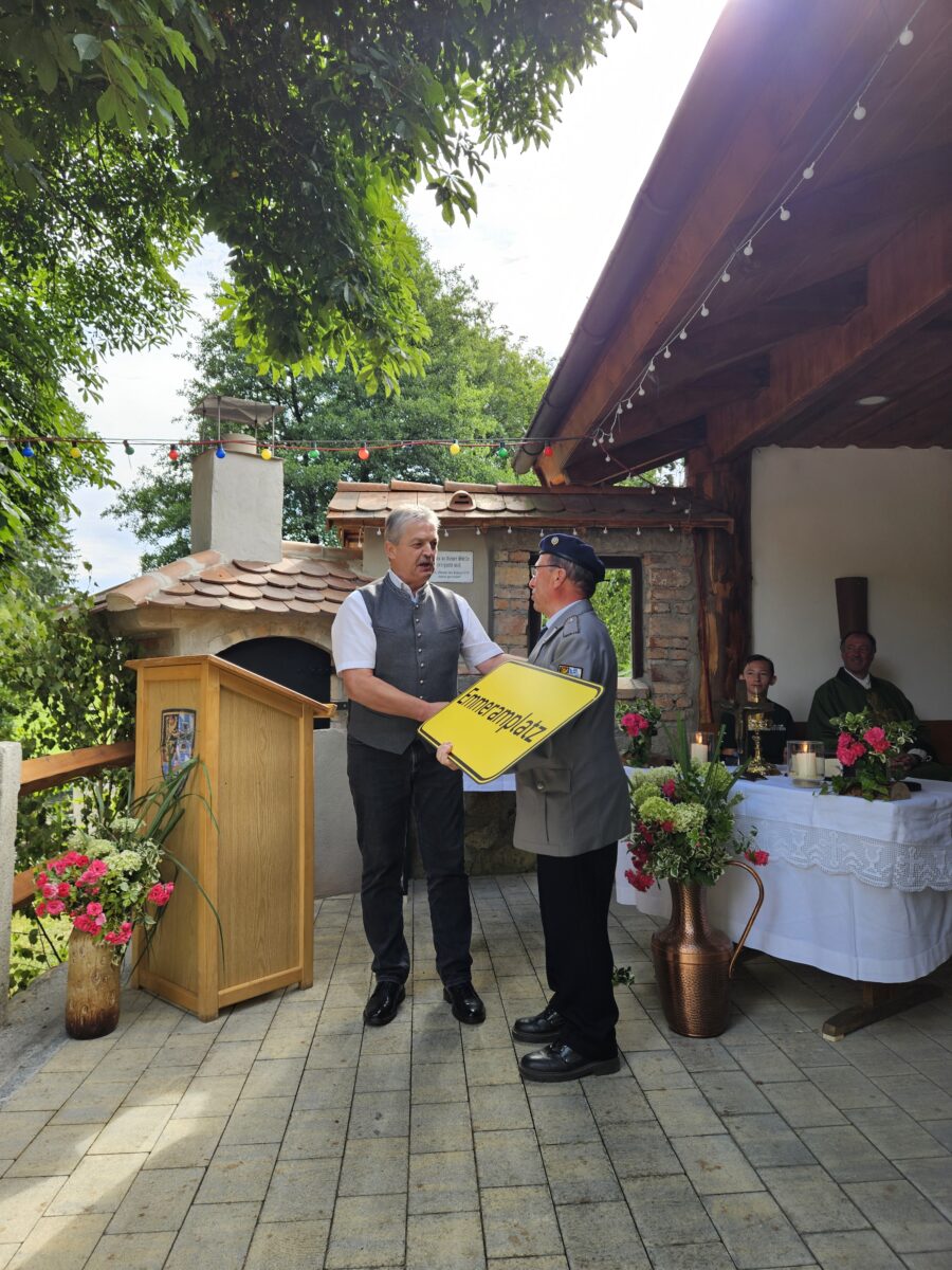 Auch Bürgermeister Andreas Wutzlhofer und Richard Berger, Kreisvorsitzender des Bayerischen Soldatenbundes (BSB), würdigten das Engagement vieler Beteiligter. Besonderer Dank galt unter anderem der Freiwilligen Feuerwehr für ihre Unterstützung. Als Zeichen der Anerkennung überreichte der Bürgermeister ein Schild mit der Aufschrift „Emmeramsplatz“ und knackte mit 500 Euro für das Projekt einen finanziellen Beitrag.