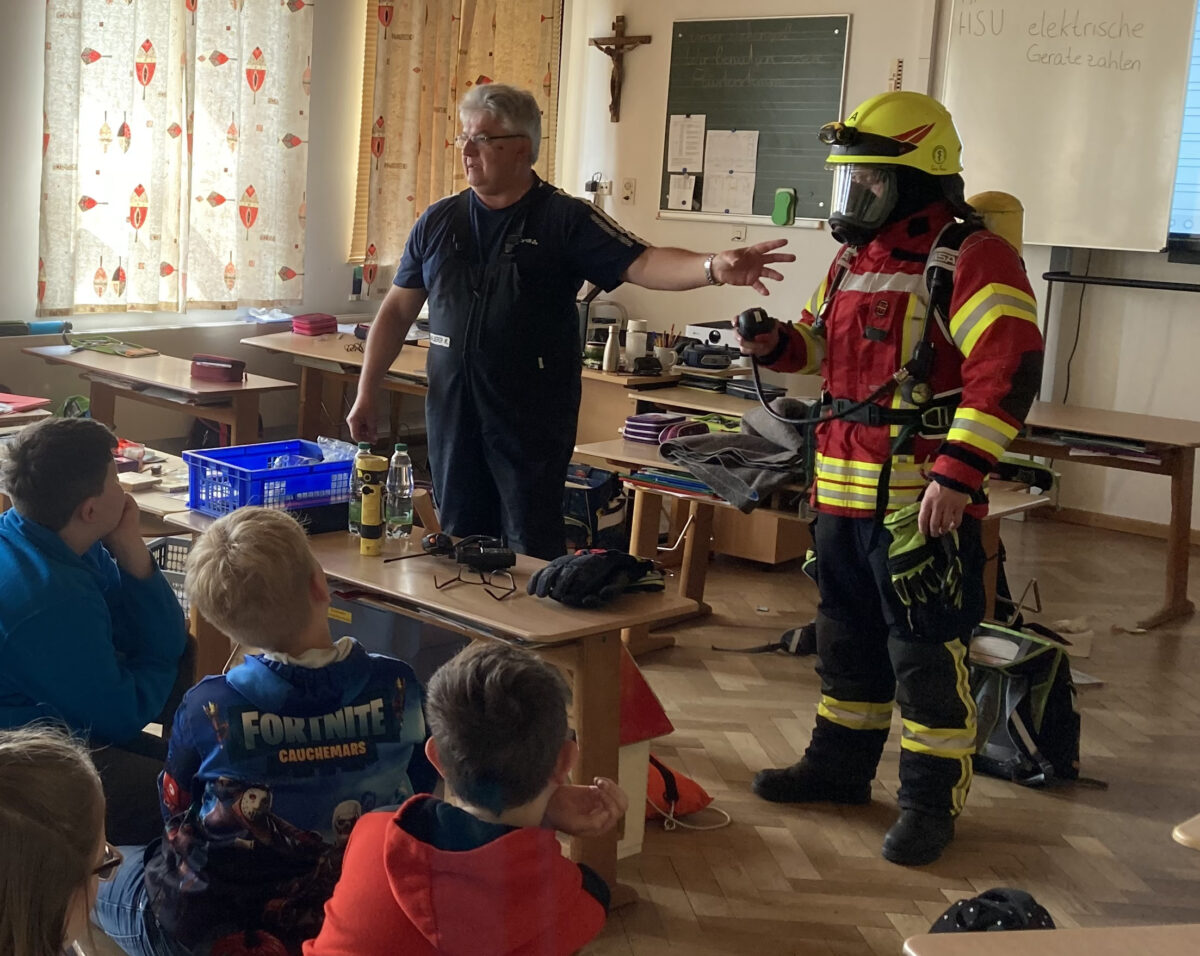 Beim Besuch der Feuerwehrleute in der Grundschule hatten diese unterschiedliches Anschauungsmaterial mitgebracht. Die beiden Feuerwehrmänner zeigten den Kindern, wie ein Feuerwehrmann mit Atemschutzgerät aussieht. Die Drittklässler staunten, als sie erfuhren, dass die Ausrüstung mehrere tausend Euro kostet und circa 30 Kilogramm wiegt.