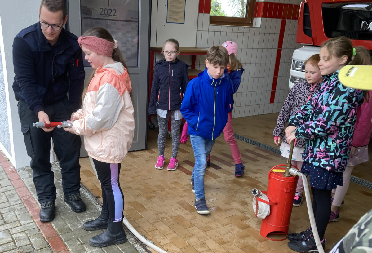 Zwei Tage später besuchten die Kinder dann das örtliche Feuerwehrhaus. Bei einer kleinen Führung durchs Gebäude sahen die Kindern die unterschiedlichen Feuerlöscher, die Schläuche und auch, welche Funktionen die Feuerwehr übernimmt. Besonders beeindruckt waren die Kinder von den Preisen, die die Jugendfeuerwehr bereits gewonnen hat. Danach wurde der Fuhrpark der Feuerwehr sowie diverse Gerätschaften bestaunt. Besonders interessant waren für die Kinder, die Rettungsschere und der Rettungsspreizer.