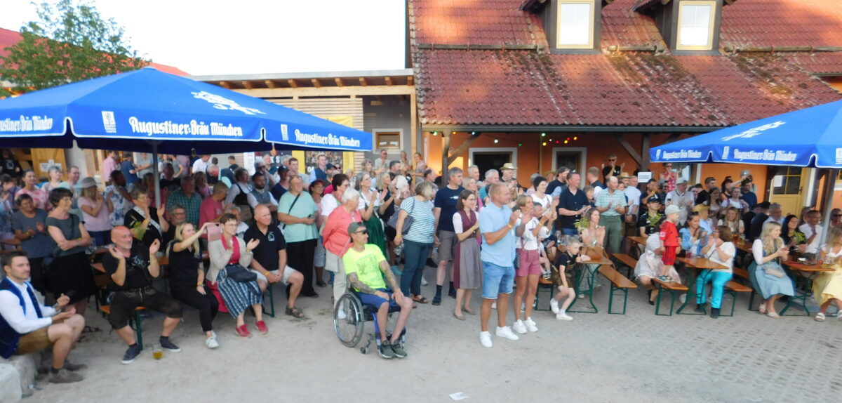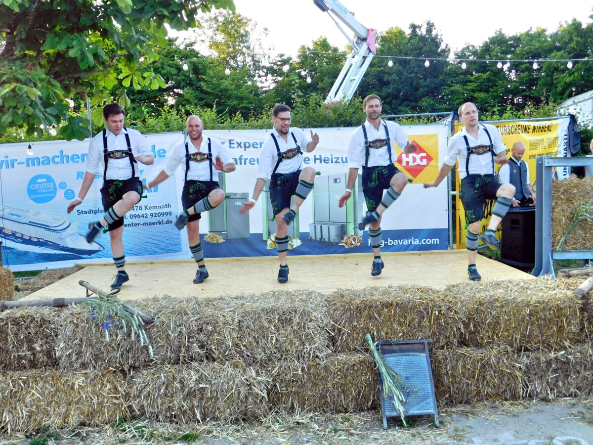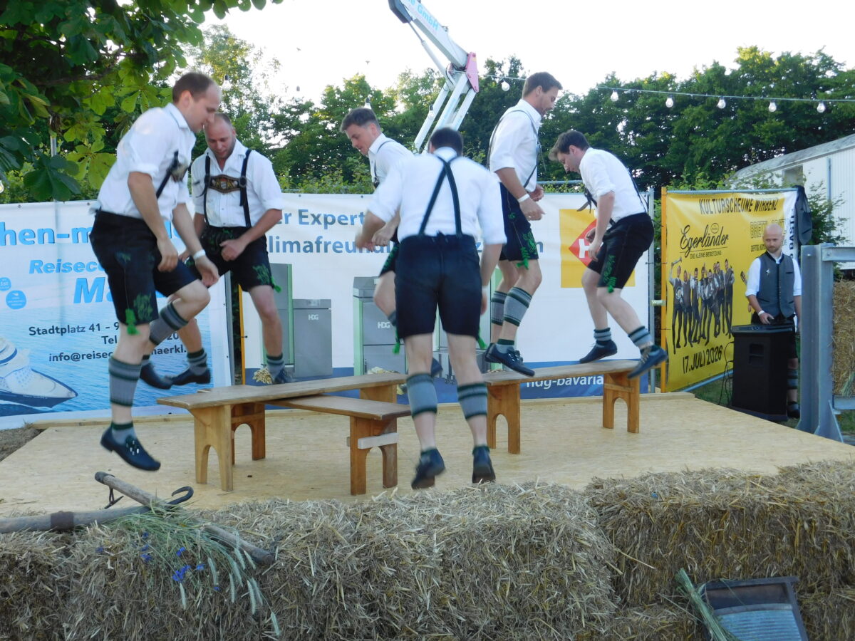 Musik für Ohren und Augen waren auch die Zwischenacts, die nahtlos überleiteten. Zunächst die Feierhaisl Boum aus Filchendorf mit ihrem „Feierhaisl-Lied“, „Hallo kleine Maus“ und „Dem Land Tirol die Treue“. Majestätische Holzbläserklänge der Kaibitzer Schlossbläser („Ein Jäger aus Kurpfalz“, „Auf auf zum fröhlich Jagen“, „Kein schöner Land in dieser Zeit“) lenkten die Stimmung ins spätnachmittäglich Feierliche. Die Bretter der Freiluftbühne vor der Kulturscheune ließen schließlich die Schwarzenbacher Schenkelzinterer mit ihren Schuhplattler-Choreografien erzittern.