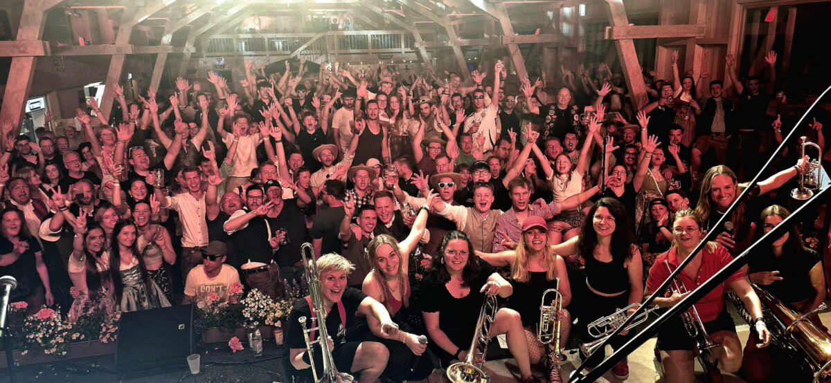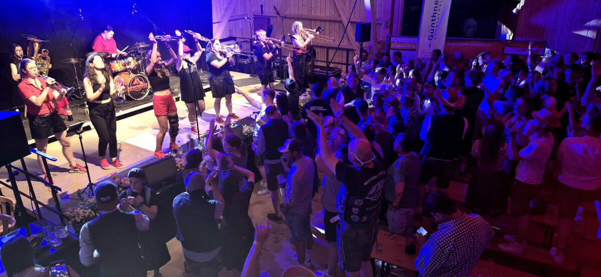 Blasmusik mit Wucht, Leidenschaft und einem Hauch Wahnsinn: Die „Brassscheune Wirbenz 2025“ wurde an Fronleichnam zum Ausnahmefestival. Vier Live-Bands, drei Zwischenacts und ein detailverliebtes Ambiente verwandelten die Scheune in einen Ort, an dem Tradition, Party und pure Lebensfreude aufeinanderprallten – und zwölf Stunden lang ein musikalisches Feuerwerk zündeten. Welch ein Brass-Sound! Welch ein Party-Mix! Welch eine geile Stimmung! 80 Helfer um die Vereinschefs Sebastian Graf und Julia Ferber waren tagelang im Vorfeld wie auch an diesem Abend im Dauereinsatz. Alles war bis ins Letzte organisatorisch, logistisch und dekorativ durchgestylt. Mit viel Fingerspitzengefühl fürs Detail hatten sie innen wie außen für ein urig-rustikales Schupfn- und Biergartenambiente gesorgt – eingebettet in Strohballen, blumengeschmückte Milchkannen und nostalgische landwirtschaftliche Geräte. Entsprechend sollten sie belohnt werden. Entsprechend gab es an allen Ecken und Enden dickes Lob. So war Silvia Schlemmer, von Mittag an bis zum Schluss in der Halle, überhaupt das erste Mal auf so einem Festival. „Wenn mir vor fünf Jahren jemand gesagt hätte, dass ich auf ein Brass-Festival gehe, dann hätte ich ihn für verrückt erklärt“, so die Weidenbergerin am Ende. „Das war heute so was von geil! Ich habe keine Minute bereut!”