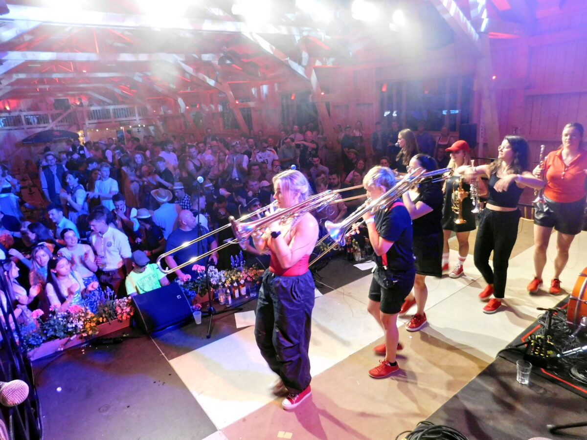 Stand ab dem frühen Nachmittag die Kultscheune schon Kopf – die ganze Halle klatschend, schunkelnd, singend und auf Bänken und Tischen wippend –, so setzte zum Grande Finale die achtköpfige Mädels-Brasspop-Truppe aus Österreich und Oberbayern noch eins drauf. „Beim Woodstock der Blasmusik erstmals gehört und sofort begeistert“, ließ Jonas Günthner das Publikum wissen – und versprach nicht zu viel. Vier Trompeten, drei Posaunen und eine Tuba, allesamt gespielt von examinierten Musikpädagoginnen – das sind die „Desperate Brasswives“. Am Schlagzeug: Quotenmann Stefan, der mit stoischer Präzision die rhythmische Basis lieferte, auf der die Ladies ihre Klanggewalt entfalten konnten.