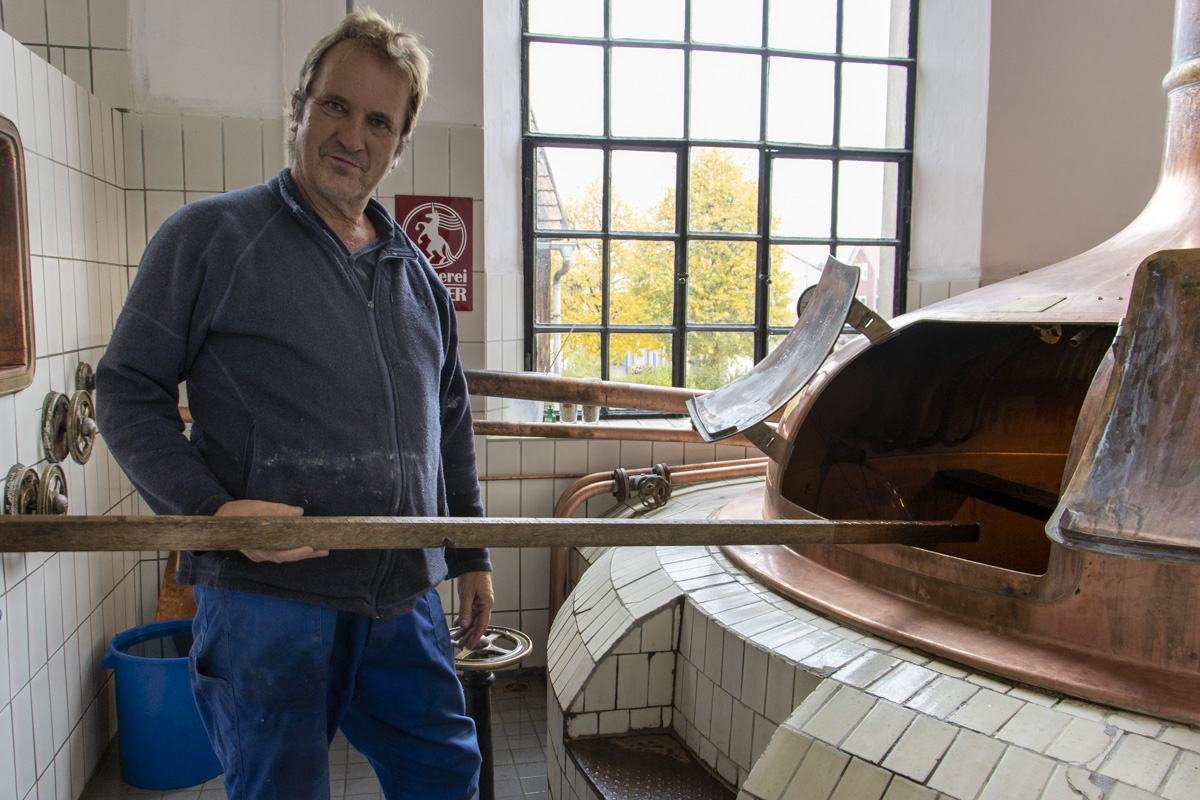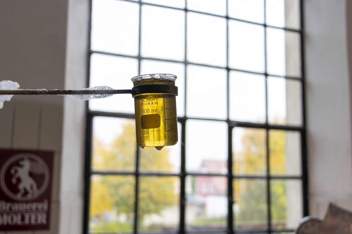 Der Sudkessel aus dem Jahr 1936 wird noch traditionell mit einem Holzofen beheizt. Auch die Temperatur messen Lino Molter und sein Vater noch in der alten Maßeinheit Réaumur. Die benötigte Ausstattung gibt es zum Teil gar nicht mehr zu kaufen, weil die Automatisierung in den 1960er Jahren in nahezu allen Brauereien Einzug gehalten hat.