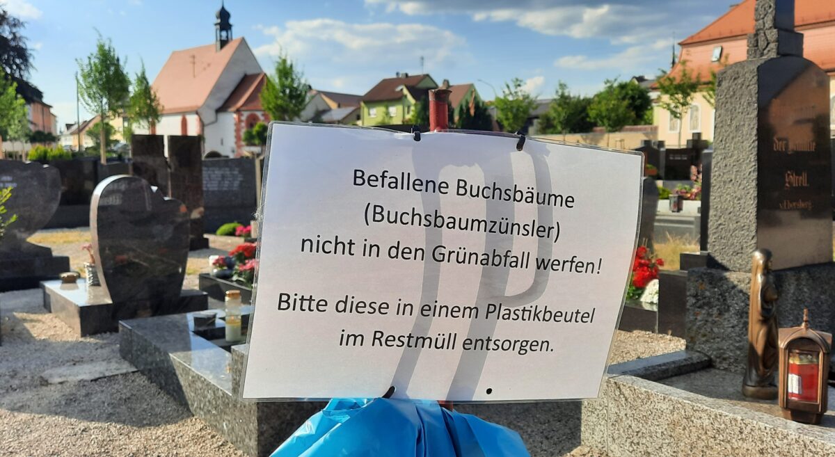 Auf dem städtischen Friedhof wurde leider wieder ein Befall von Gräbern mit dem Buchsbaumzünsler entdeckt. Hierbei handelt es sich um Raupen, welche Schäden durch Kahlfraß an Buchsbäumen verursachen und sich rasant ausbreiten.