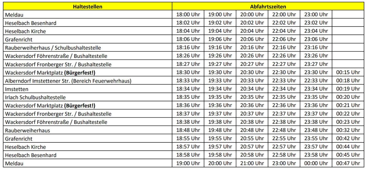 Erstmals in der Geschichte des Wackersdorfer Bürgerfests bietet die Gemeinde Wackersdorf am Freitag- und Samstagabend einen kostenfreien Shuttlebus-Service an. Von jeweils 18:00 Uhr bis kurz nach Mitternacht verkehrt der Bus stündlich zwischen den Wackersdorfer Ortsteilen und dem Bürgerfest-Gelände (Lenkzeit-bedingte Pause zw. 21:00 und 22:00 Uhr!). Achtung: Die Abfahrtszeiten sind ca.-Angaben! Bis auf die Haltestelle „Albendorf Imstettener Str. (Bereich Feuerwehrhaus)“ handelt es sich um reguläre Bus- bzw. Schulbushaltestellen. Der Fahrplan: