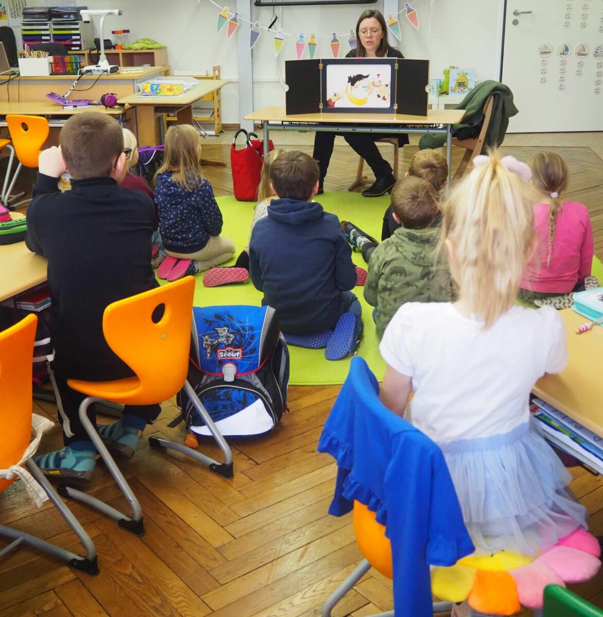 In den Klassen der flexiblen Eingangsstufe lasen die beiden Kindergartenleiterinnen Stefanie Unterburger und Sabine Schreiber-Schöpf sowie die Erzieherinnenschülerin Andrea Bayer vor. Die dritten Klassen hörten bei Studienrätin Andrea Hetschger und bei Mediendesignerin Nicola Schinner zu. In den vierten Klassen begeisterten Logopädin Hannah Bayer und Lehrerin Nadine Meiler. Die neunte Klasse besuchte die Ergotherapeutin Evelyn Hartmann mit ihrem Therapiehund Negro. Die Klasse 8M hatte ein digitales Vorleseformat gewählt. Hier las Marc Mann in seinem YouTube-Kanal.