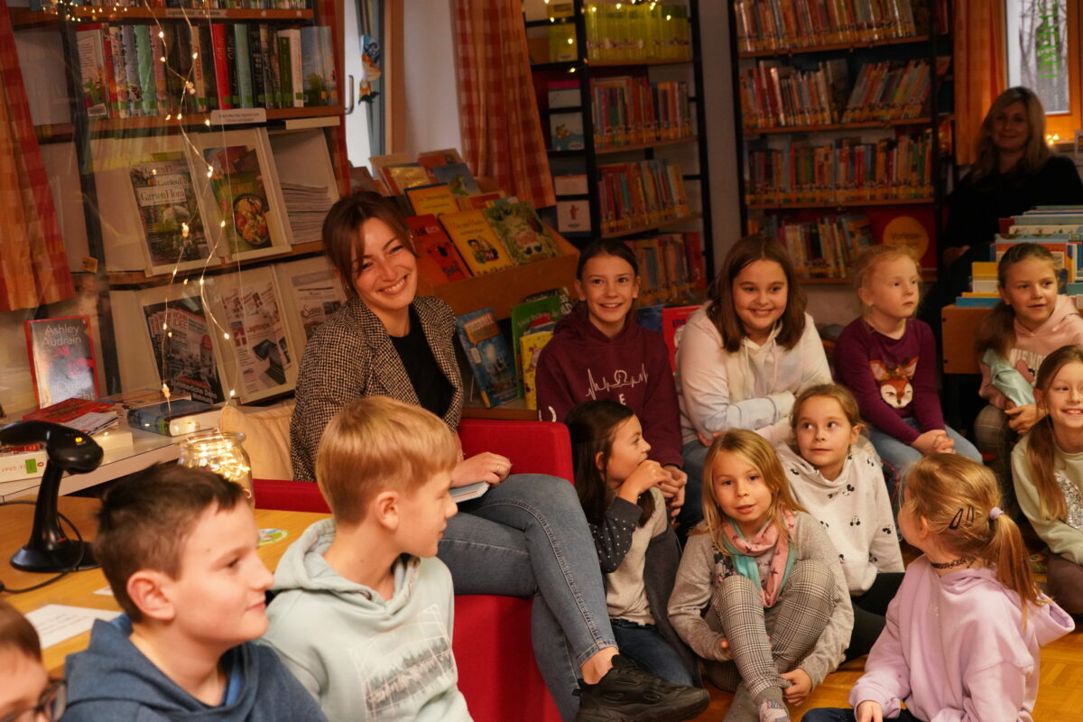 Anna Hoover las aus dem Spiegel-Bestseller „Ein Freund wie kein anderer“ von Oliver Scherz mit Bildern von Barbara Scholz. Es handelt sich im Buch um das Erdhörnchen Habbi und einen kranken Wolf. Schnell stellten die Mädchen und Buben fest, dass man gemeinsam auch einzigartig sein kann.