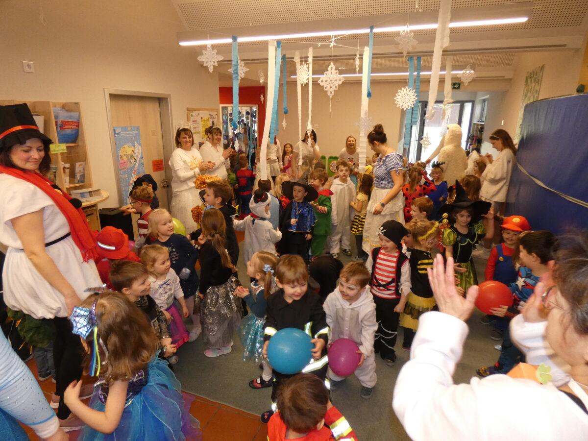 Am Donnerstag wurden die Kinder im Kindergarten in ihren Gruppen mit Faschingsmusik, Luftschlangen und Luftballons empfangen. Es wurde ausgelassen getanzt und gespielt. Zur Brotzeit stärkten sich die Kinder im ganzen Haus mit Wienern und Semmeln, bevor in jeder Gruppe ein süßes Buffet wartete. Um 10 Uhr startete die große Polonaise durch das gesamte Haus. Nacheinander reihten sich alle Gruppen ein, sodass eine lange, fröhliche Faschingsschlange entstand. In der Halle endete der Umzug in einer gemeinsamen Party mit Musik, Tanz und viel guter Laune. Auch die Krippenkinder feierten an diesem Tag ausgelassen: In der Halle wurde gemeinsam mit Musik getanzt und Faschingstreiben erlebt.