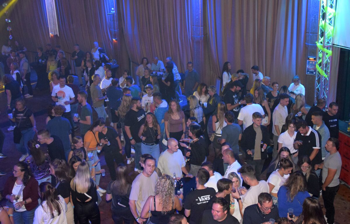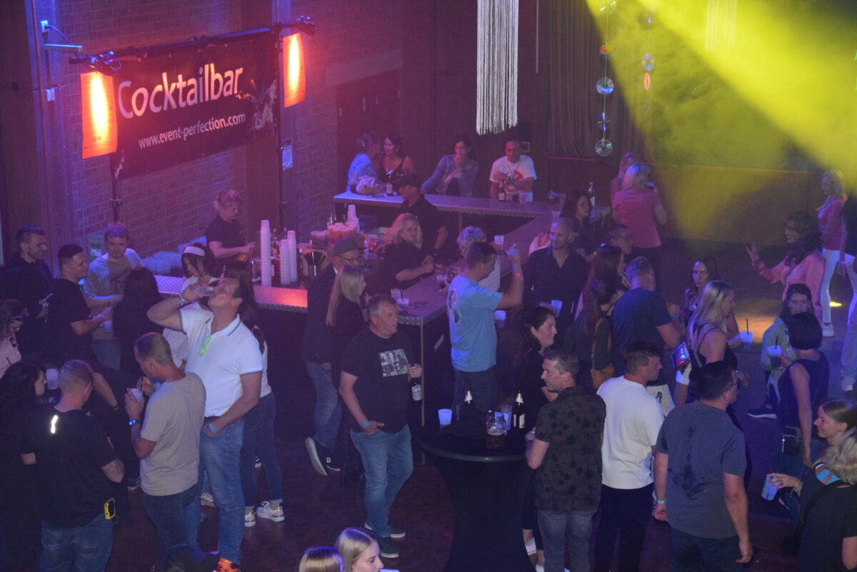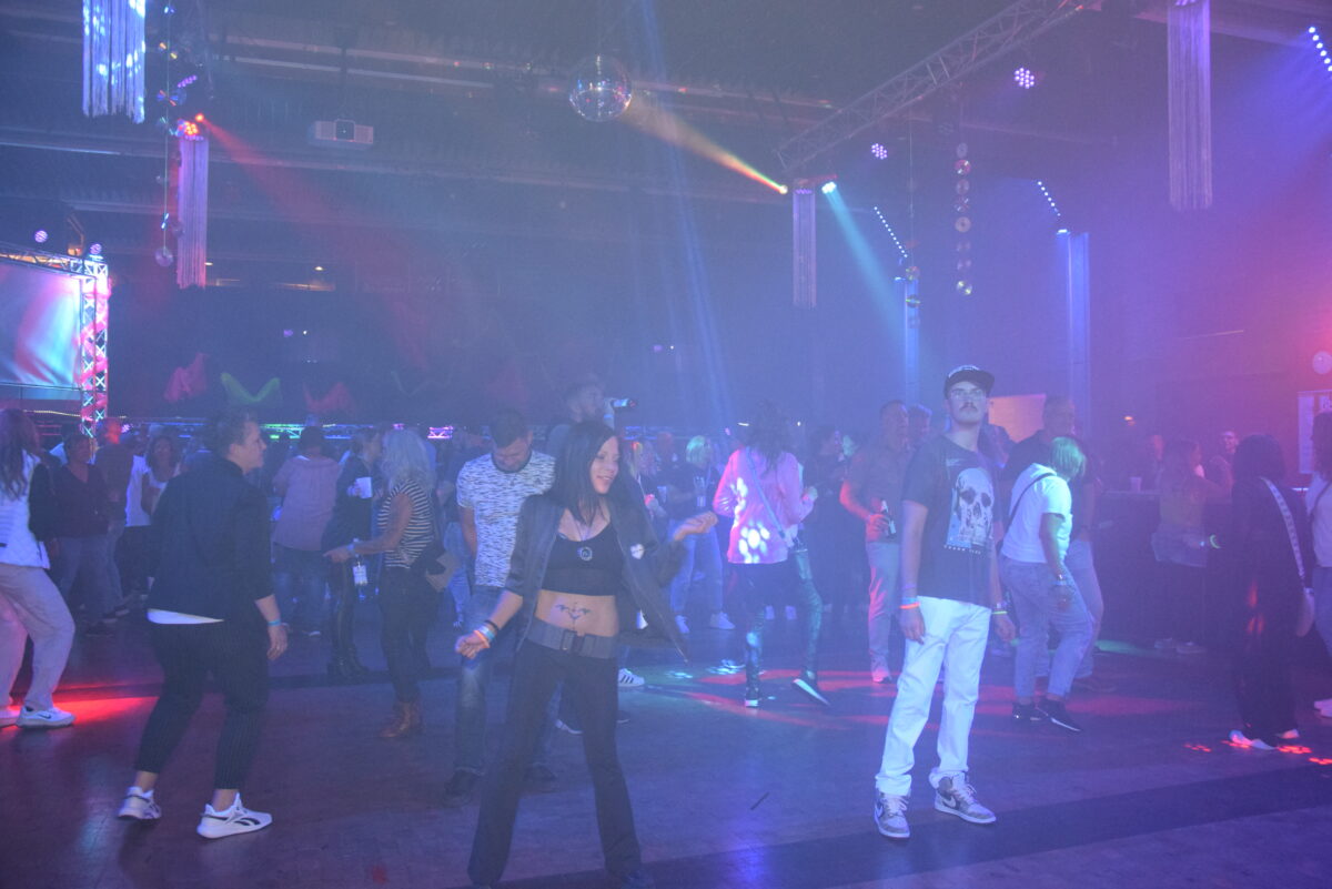 Die Türen der Stadthalle öffneten sich pünktlich um 20.30 Uhr. Die Gäste wurden mit bunten Neonsonnenbrillen empfangen und konnten sich mit Knicklichtern zusätzlich dekorieren. Die Besucher verteilten sich auf die beiden Bereiche und hatten die Möglichkeit, im Laufe des Abends zwischen den verschiedenen Musikjahrzehnten zu wandeln.