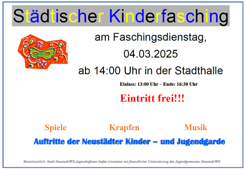 Am Dienstag, 4. März, lädt die Stadt Neustadt/WN zum großen städtischen Kinderfasching ein. Die Veranstaltung ist eine feste Größe im lokalen Veranstaltungskalender und verspricht wieder ein buntes Treiben für die Kleinsten zu werden.